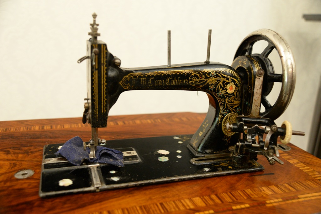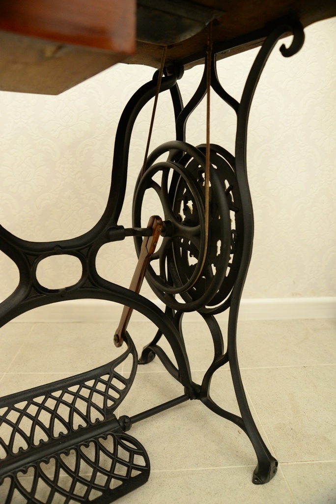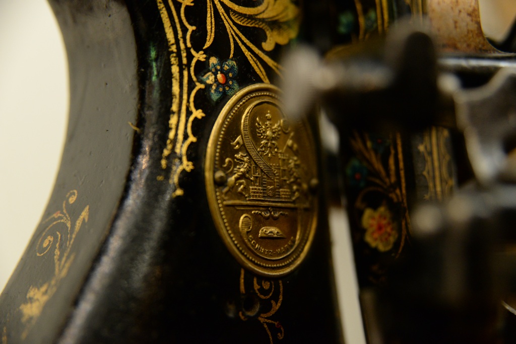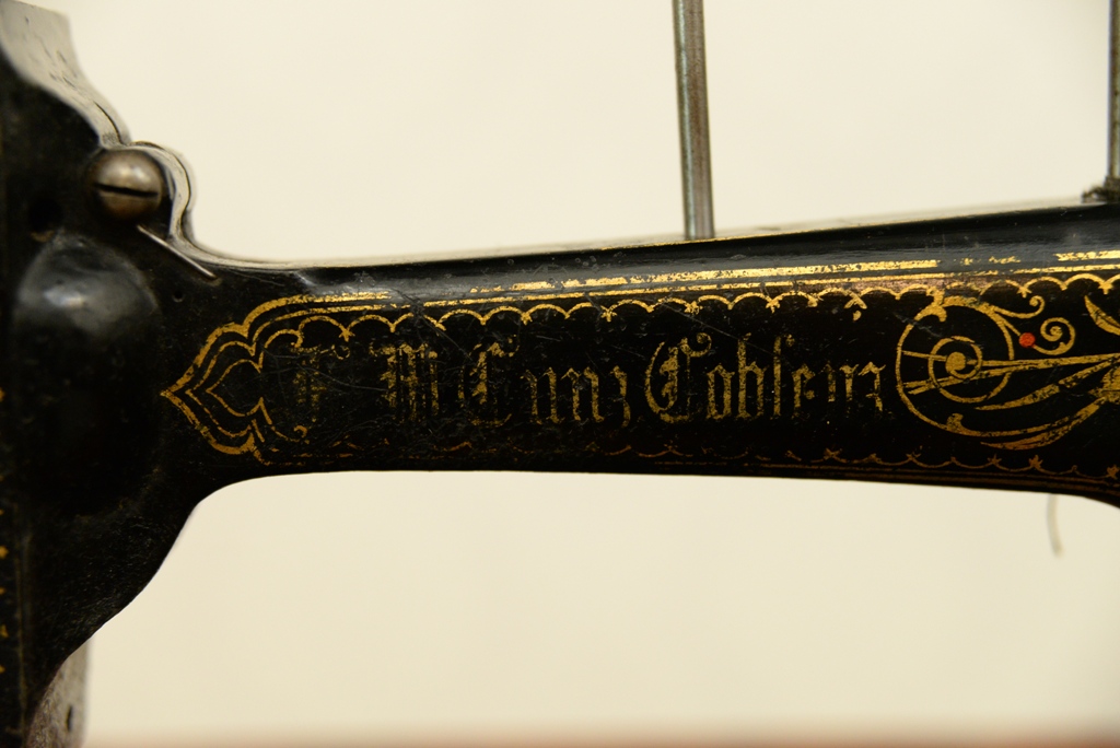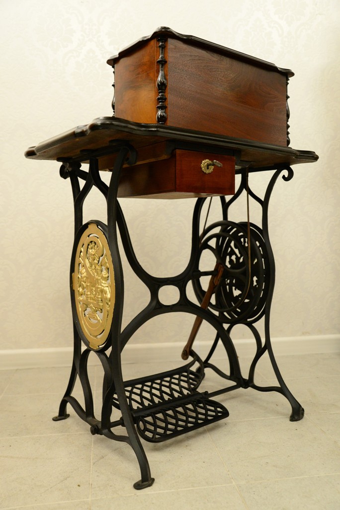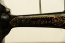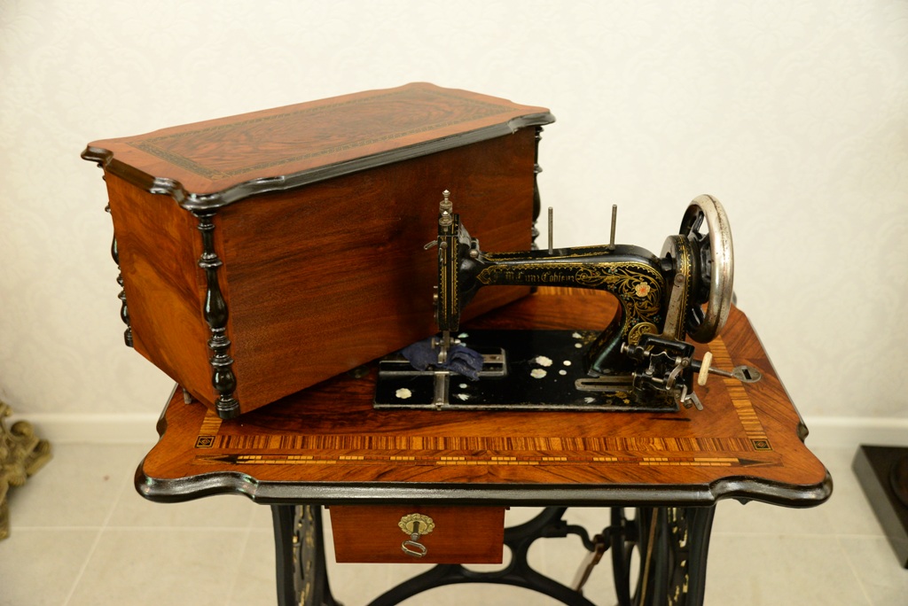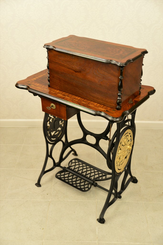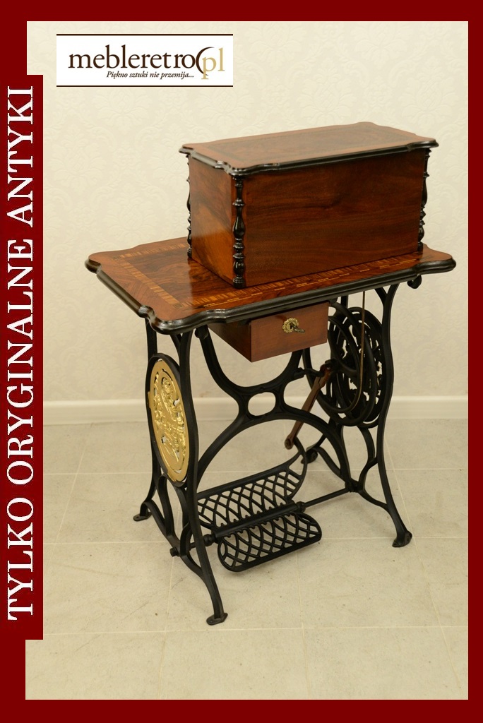 Maszyna bardzo bogato zdobiona licznymi intarsjami znajdującymi się zarówno na stoliku jak i na pokrywie maszyny! Zarówno blat jak i pokrywa zdobione czernionymi elementami - charakterystycznymi frezami czy półkolumnami! Sama maszyna zdobiona pięknymi malunkami o tematyce roślinnej z dodatkami masy perłowej mieniącej się pod różnymi kątami!