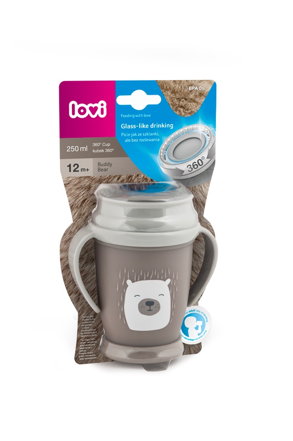 Kubek LOVI 360° ułatwia przechodzenie od ssania płynu z kubka treningowego i kubka niekapka do picia ze szklanki. Dzięki innowacyjnemu systemowi uszczelniania przyzwyczaja dziecko do naturalnego sposobu picia (jak z otwartego kubka), ale bez rozlewania. Posiada opatentowaną ochronę przed bakteriami.