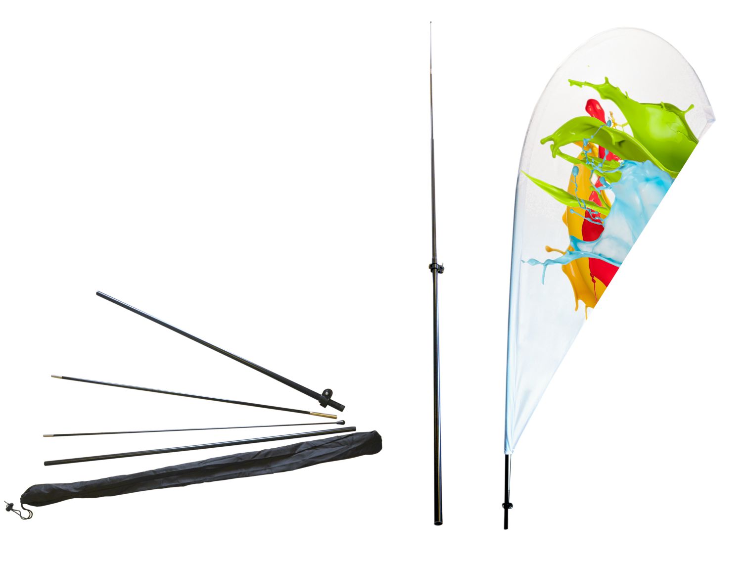 Рекламный флаг намотки на флагштоке 350 см в комплекте с подставкой, вставленной в основание.