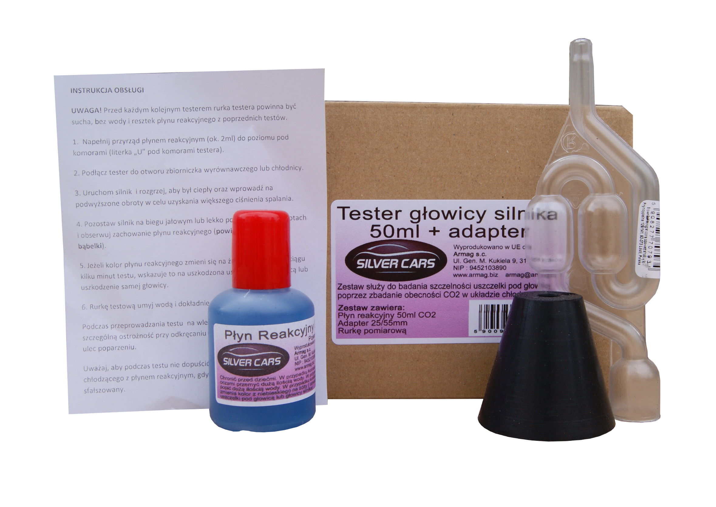 Тестер был создан, чтобы исключить подозрения на повреждения прокладки головки блока и же головки в автомобилях с двигателем внутреннего сгорания бензиновых, дизельных и LPG с воздушным охлаждением. В случае, если прокладка происходит утечка газа, и СО2 проникает к системе охлаждения, жидкость реакционных меняет цвет на желтый или зеленый.