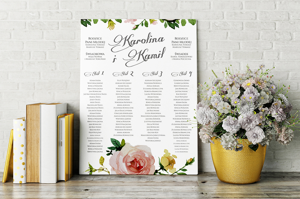 Оригинальный индивидуально оформленный плакат, на котором размещены списки гостей из-за вас за столом. Расположенный у входа, он поможет гостям найти свое место на зал.