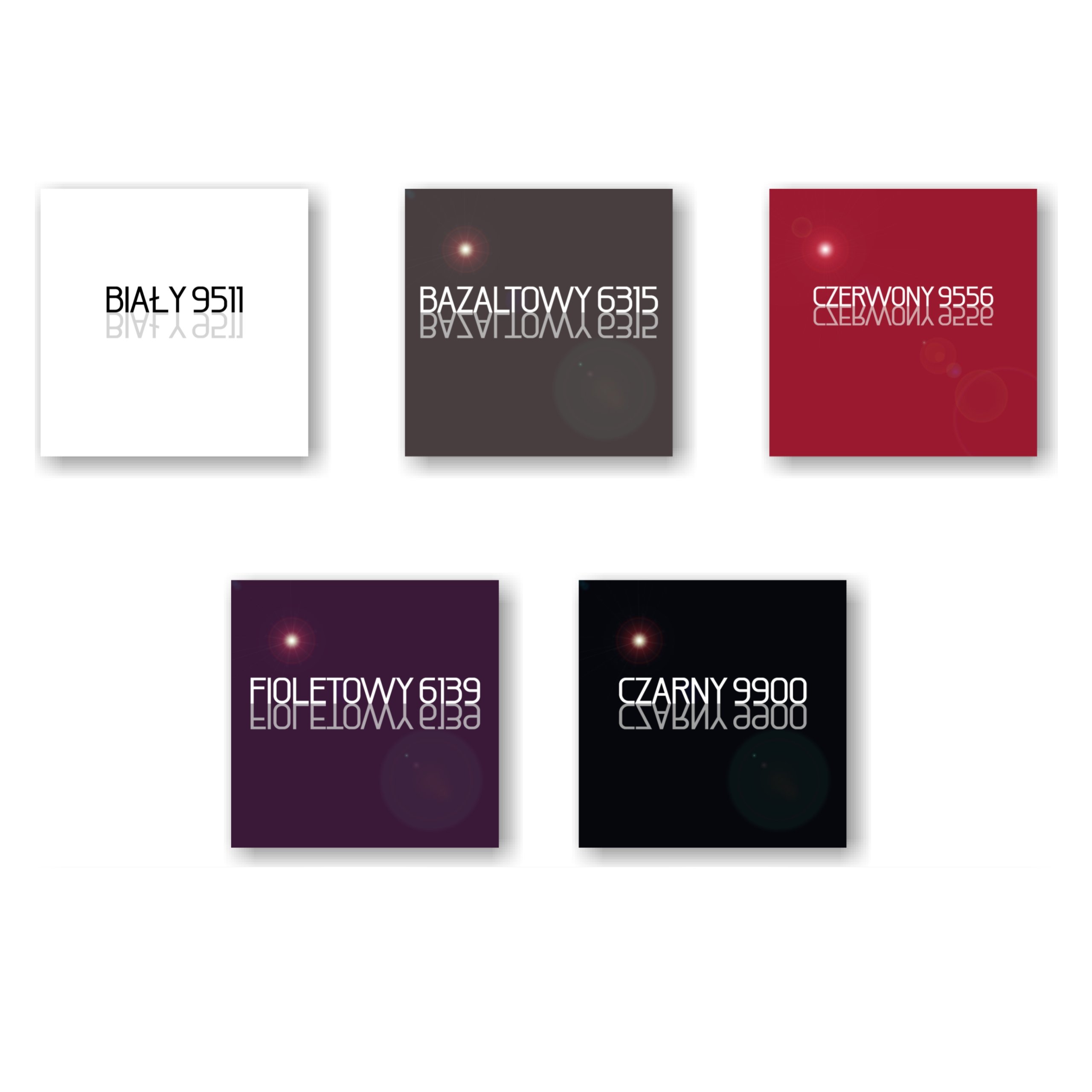 Korpusy mebli wykonane są w kolorze białym. Fronty mebli (wysoki połysk) mogą być wykonane w następującej kolorystyce: