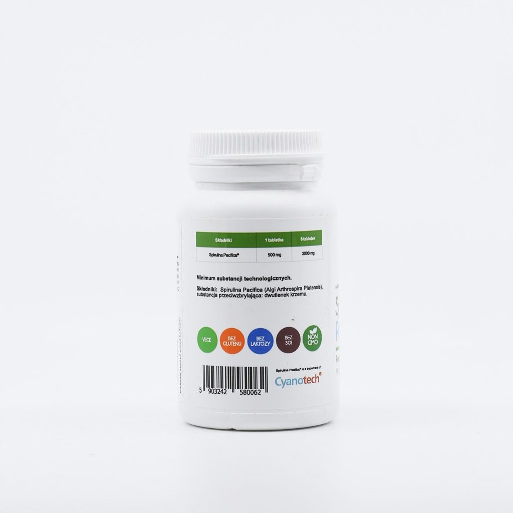 Składniki: Spirulina Pacifica (Algi Arthrospira platensis), substancja przeciwzbrylająca: krzemionka koloidalna.