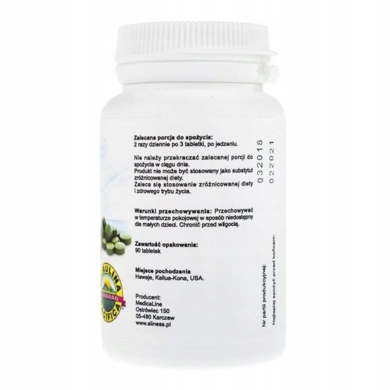 Aliness Hawajska Spirulina Pacifica® to suplement diety algi Spirulina Pacifica pochodzące z czystych wód basenu Pacifiku Kailua-Kona na Hawajach (USA)osuszonych przy użyciu opatentowananej technologii Ocean Chill Drying™ (patent nr 5,276,977 USA) zapewniającej najwyższą jakość oraz biodostępność wszystkich składników odżywczych.