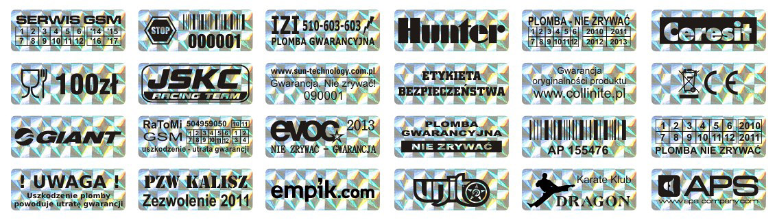 Idealnie nadają się do klejenia na powierzchniach płaskich i lekko zakrzywionych oraz na łączeniach różnych elementów. Powierzchnie zanieczyszczone należy oczyścić i odtłuścić przed naklejeniem plomby. Całkowite utwardzenie kleju i pełna funkcjonalność następuje w ciągu 24 godz. od przyklejenia etykiety.