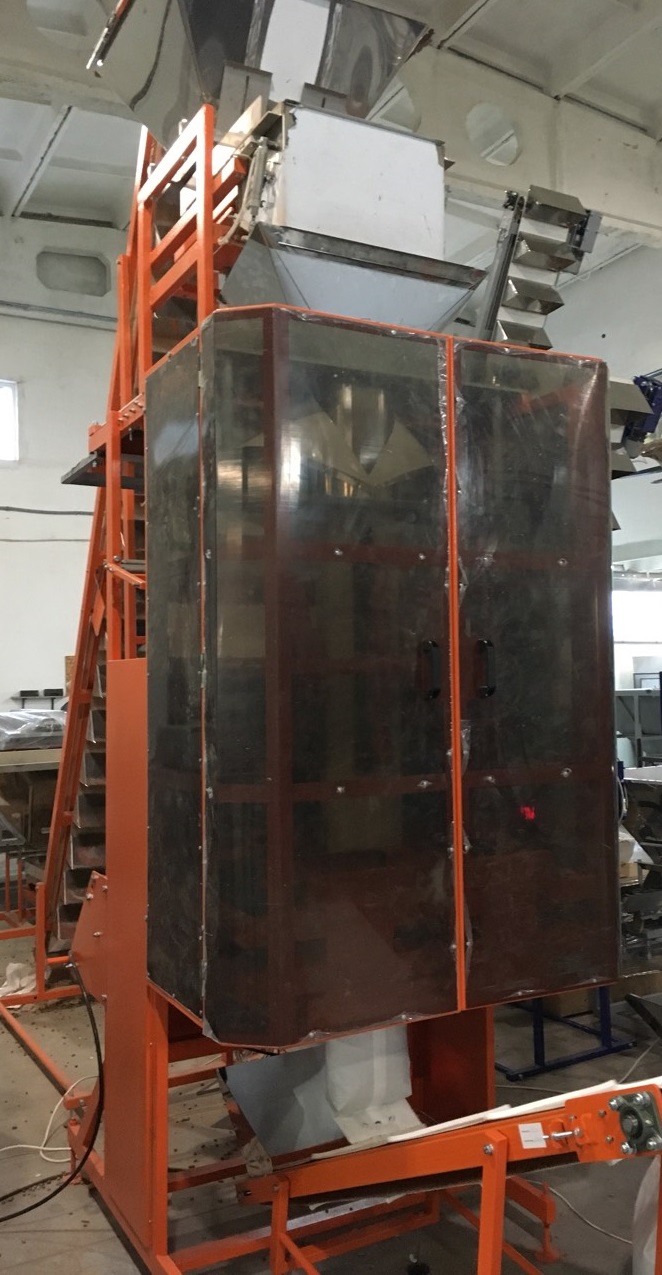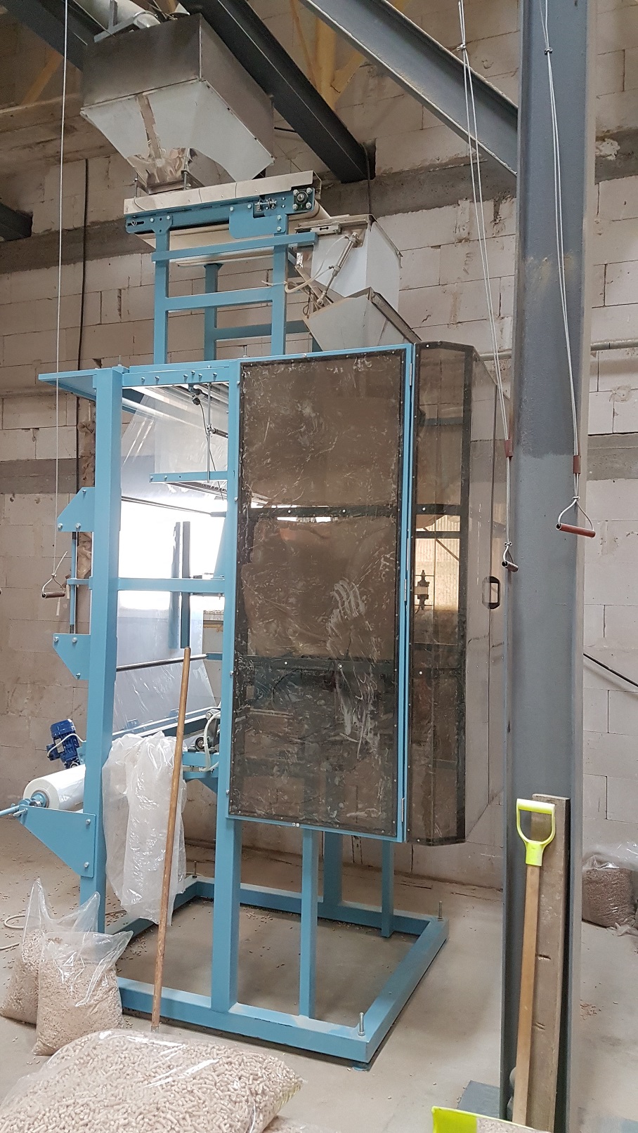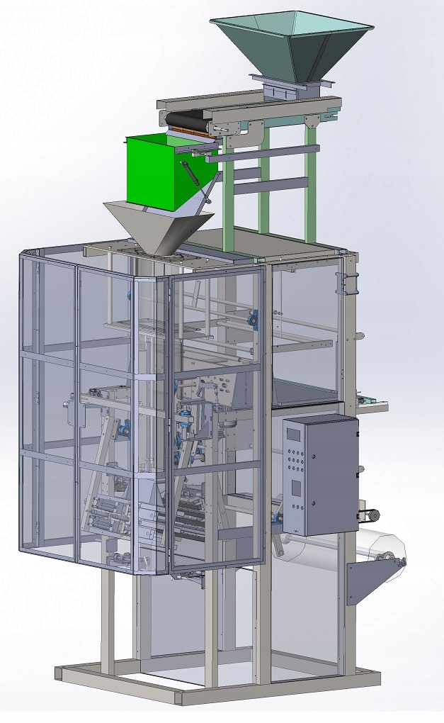 Automat pakujący pionowy / Pakowaczka do Pelletu / Automatyczna maszyna do pakowania peletu wyposażony w dozownik wagowy i przeznaczony jest do pakowania w worki niewielkimi dawkami sypkich niepylących produktów, takich jak: pasza, paliwowe granulki, proszek do prania, piasek, palety, cukier, zboże, sól, żwir, kamienie, żwir, wypełniacze dla zwierząt, torf itp.