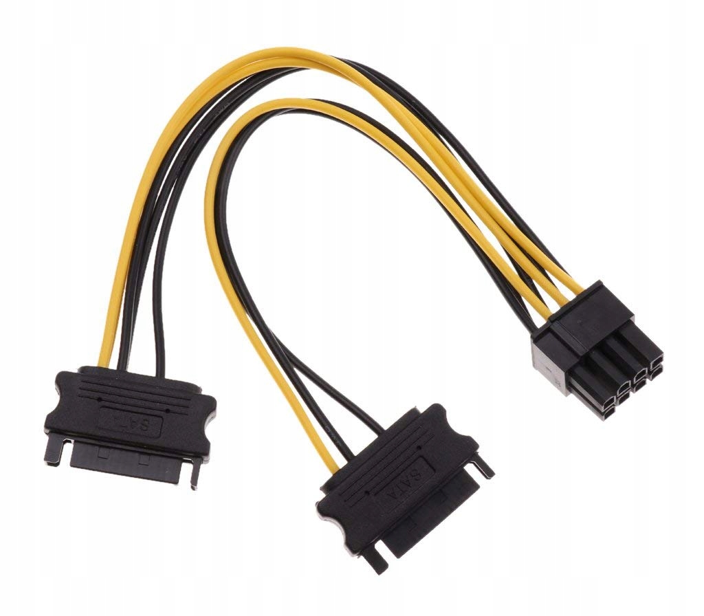 Кабель позволяет через 2 разъема SATA 15 Pin подключить питание к видеокарте через 6-контактный / 8-контактный разъем PCIe. Специальная конструкция штекера 6/8Pin (2 контакта можно отсоединить от штекера) позволяет подключить кабель к разъему как 6pin PCie, так и 8pin PCIe.