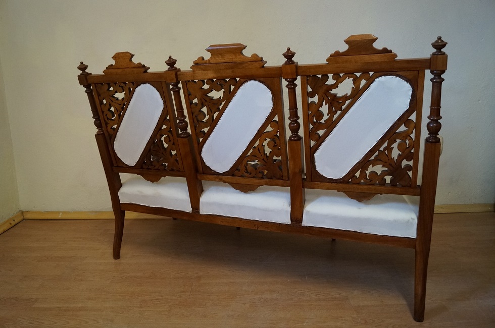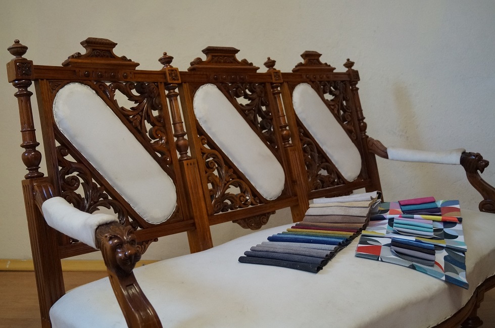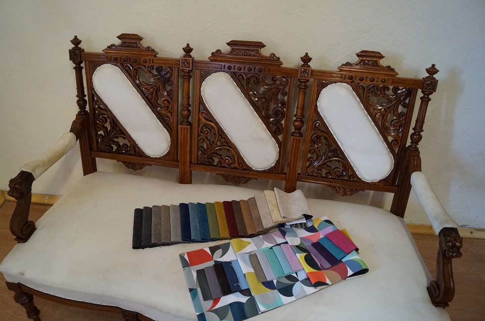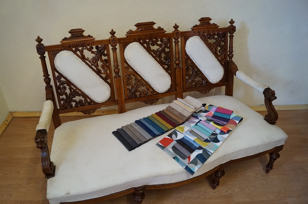 Kanapa po renowacji , tapicerka obita materiałem podkładowym