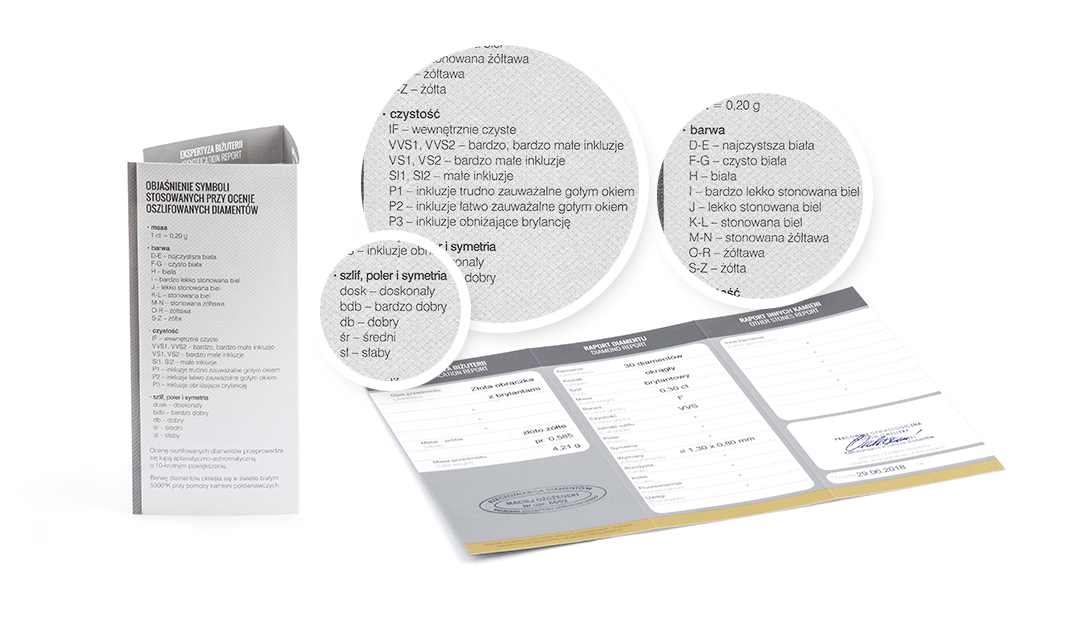 Clarity (чистота) - количество включений и пятен, их расположение, различимость и влияние на сияние. Skala czystości: IF, VVS, VVS2, VS, VS2, SI, SI2, P1, P2, P3.