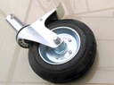 Koła skrętne z hamulcem mocowane na trzpień są połączeniem widelca wykonanego z tłoczonej blachy stalowej oraz koła z piastą stalową i oponką z pełnej czarnej gumy. Głowica skrętna widelca jest podwójnie ułożyskowana. Elementy metalowe zestawu pokryte są antykorozyjną powłoką chromowo-cynkową włącznie z trzpieniem.