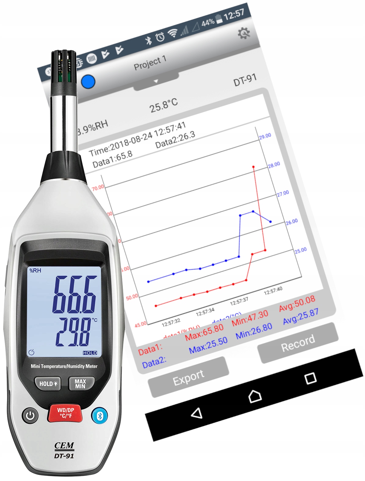 Oprogramowanie dostępne na telefonie pozwala rejestrować pomiary temperatury i wilgotności oraz przesłać je bezpośrednio: E-mailem w postaci wykresu (plik graficzny) oraz *.xls (EXEL - dane tekstowe)