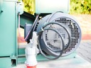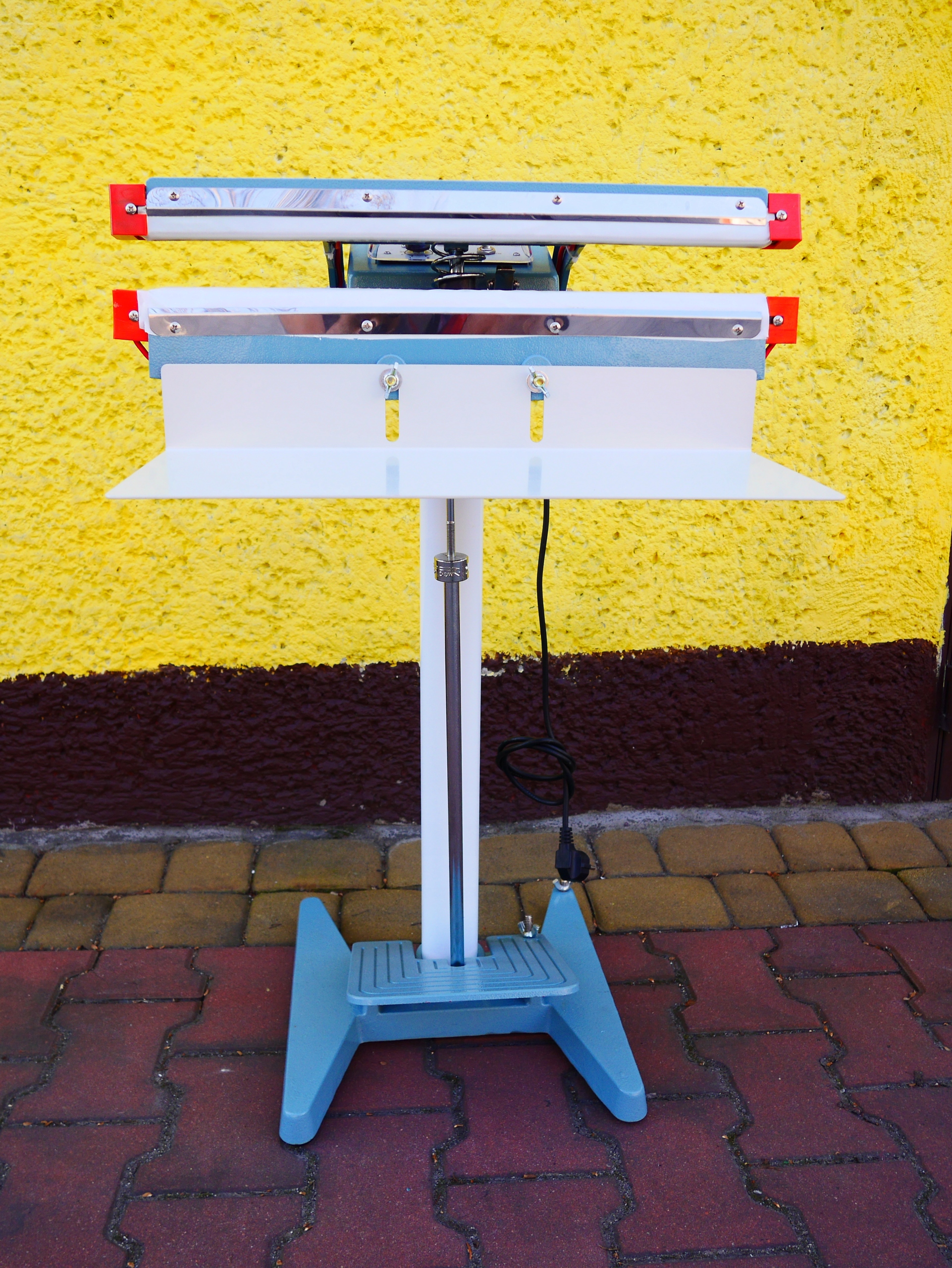 Urządzenie przeznaczone do zgrzewania worków napełnionych gotowym peletem. Poprzez naciśnięcie pedała umieszczonego na ziemi następuję błyskawiczne zgrzanie worka, dzięki czemu jest gotowy do dalszej odsprzedaży.