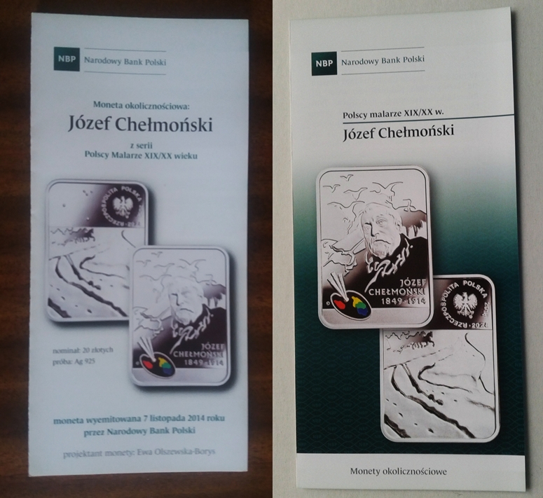 Mam do sprzedania foldery NBP do monet o nominale 20 zł z serii: Polscy malarze XIX/XX wieku - JÓZEF CHEŁMOŃSKI.