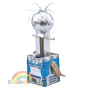 Odkryj zjawiska wywołane elektrycznością statyczną, która jest wytwarzana za pomocą poruszającego się gumowego pasa i magazynowana na pokrytej aluminium plastikowej sferze. Będziesz mieć okazję przeprowadzić eksperymenty takie jak podnoszenie się pasemek aluminiowych przymocowanych do sfery albo świecenie neonówki.