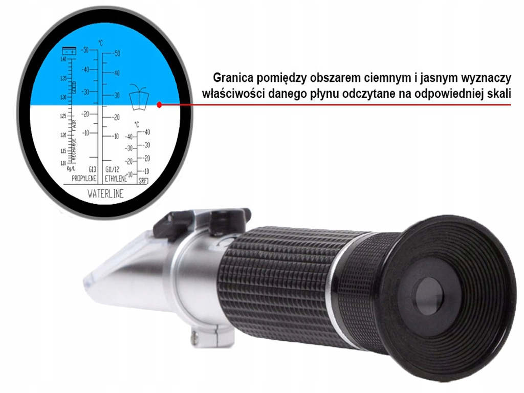 Refraktometr jest urządzeniem pozwalającym określić właściwości fizyczne cieczy za pomocą pomiaru współczynnika załamania światła na granicy ośrodków. Dzięki temu można określić: