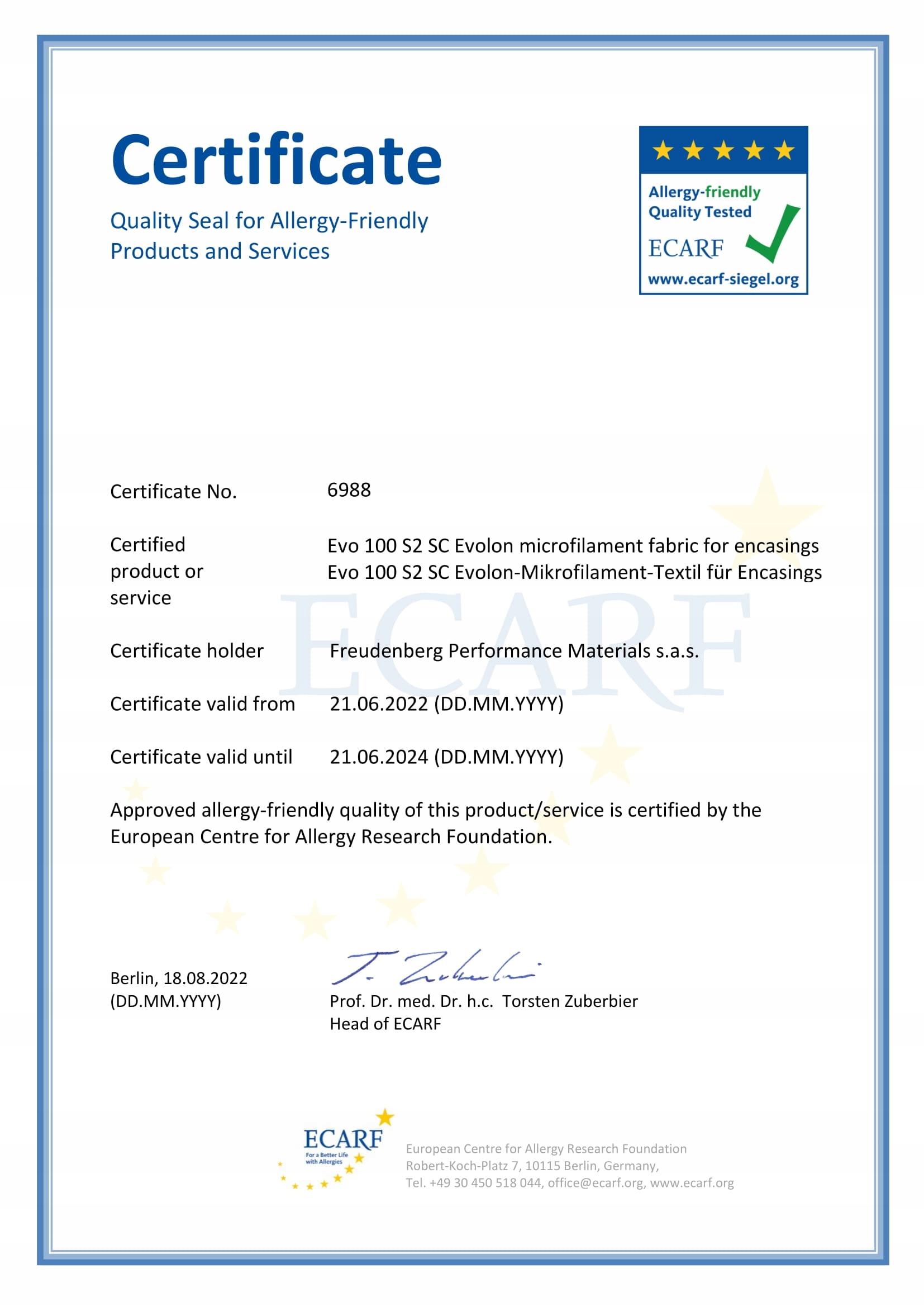 Evolon® został nagrodzony niezależnym znakiem jakości Fundacji Europejskiego Centrum Badań nad Alergiami (ECARF). Ma to na celu pomóc alergikom w wyborze odpowiednich towarów i usług poprzez certyfikowanie jakości produktów i usług zgodnie ze ścisłymi standardami.