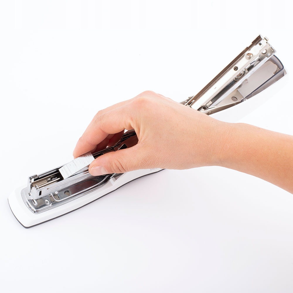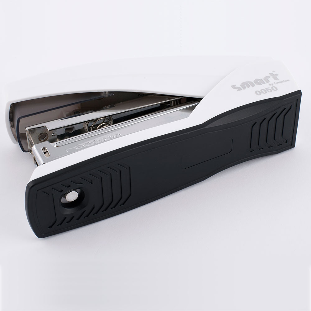 Уникальный офисный степлер с уменьшением силы сшивания до 60%, это делает сшивание большего количества карточек легким и приятным. Скрепляет до 50 листов. Степлер изготовлен из прочного пластика, внутри он имеет металлический механизм.
