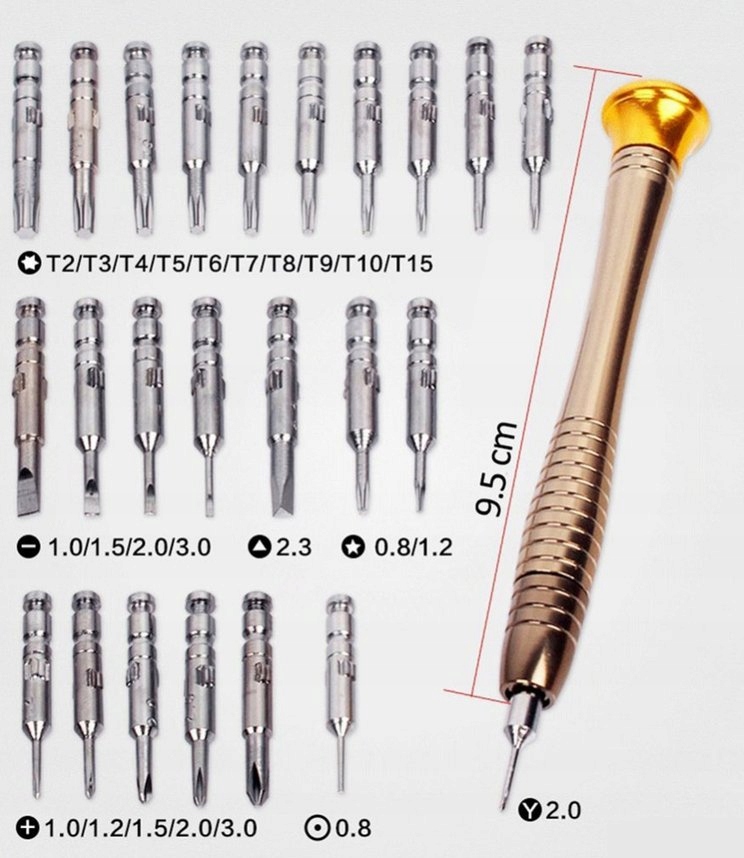 Zestaw składający się z 24 końcówek oraz bardzo wygodnej wyprofilowanej rączki, co tworzy komplet umożliwiający serwisowanie oraz naprawę większości drobnych urządzeń elektronicznych GSM, AGD, RTV