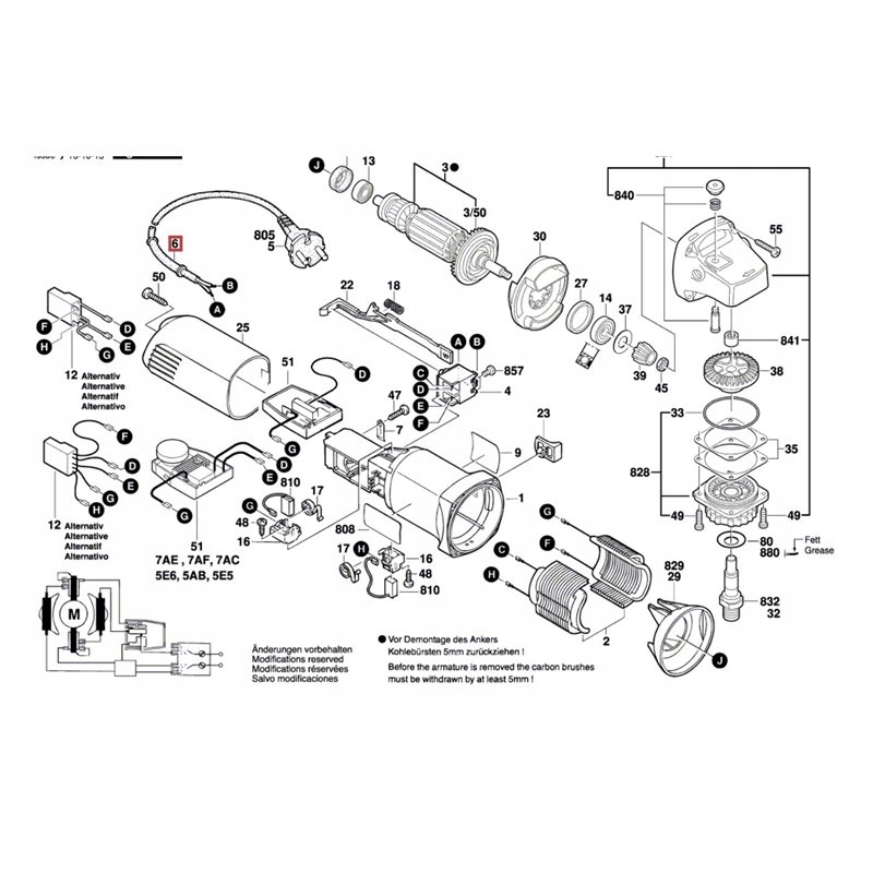 Этот конденсатор (фильтр защиты от помех) должен быть отсоединен от шлифовальной машины, потому что наш регулятор подключается так же, как № 51 7AE, 7AF, (...) то есть: провод G идет к статору, А D и E-к средних контактов выключателя.