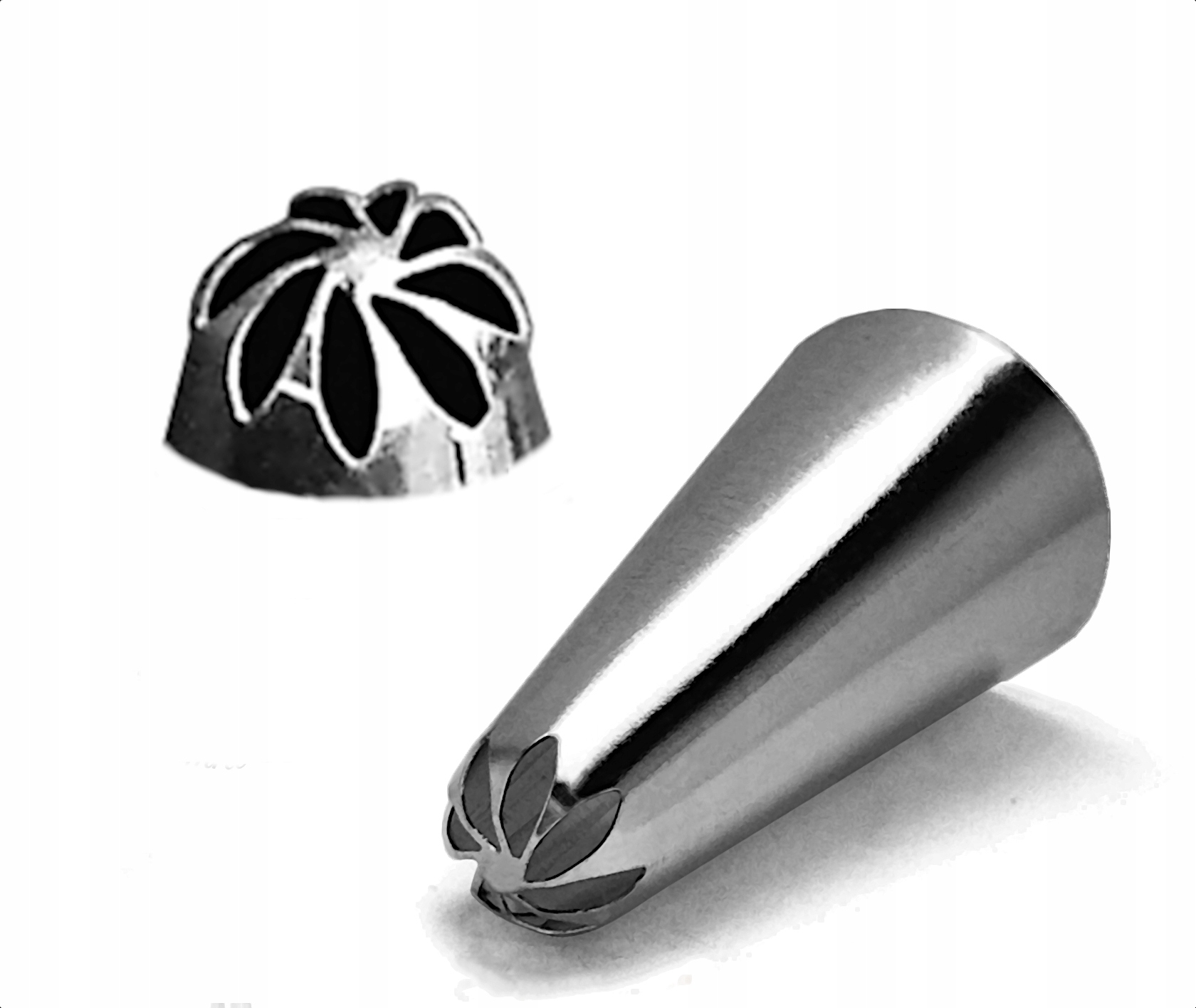 Gładka i zamknięta końcówka dekoracyjna w rozmiarze 8 mm. Zagięte do środka i połączone ze sobą igiełki pozwolą nam uzyskać kształtne płatki kwiatuszka, bez nadmiaru kremu ciągnącego się środkiem wzoru. Wykonywaniu takich zdobień sprzyja spiralne ułożenie igieł.