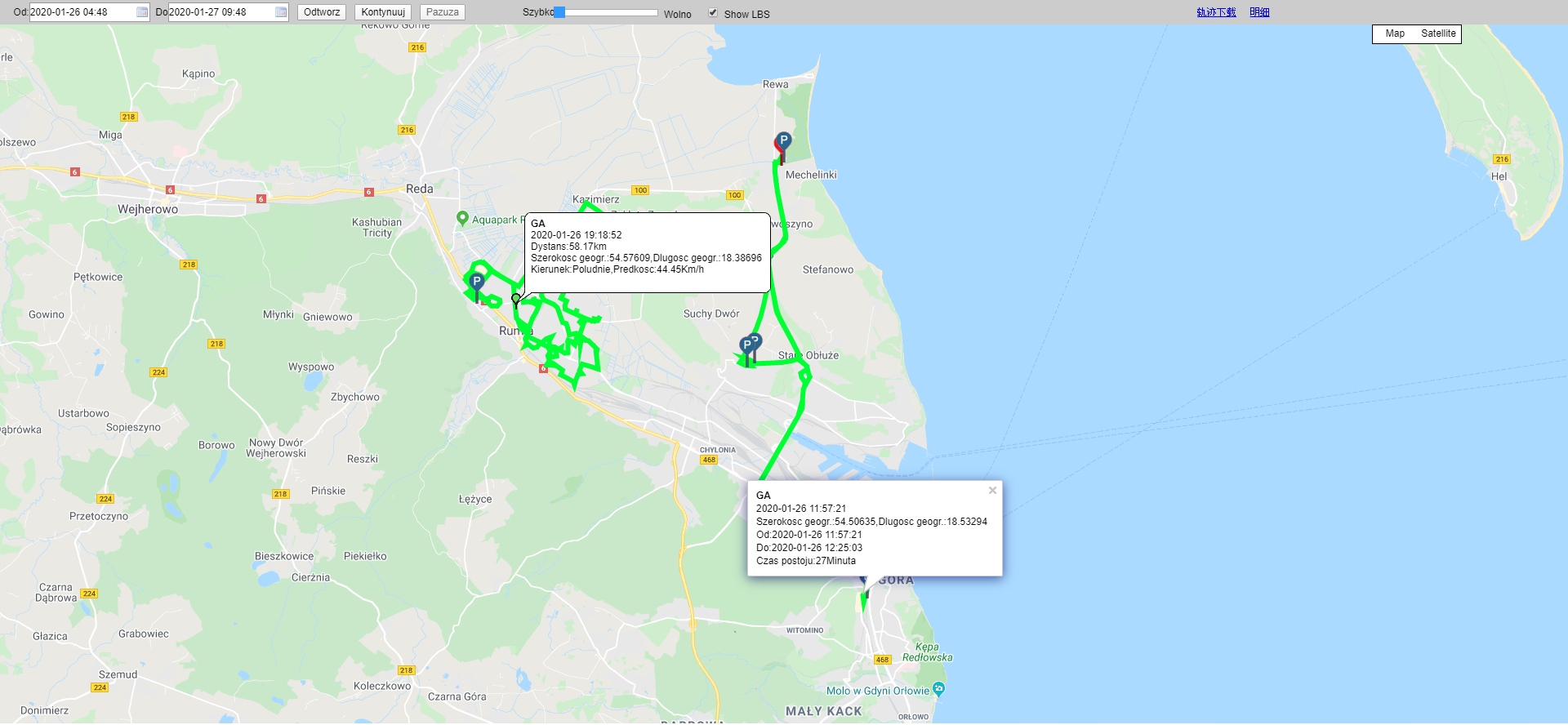 Воспроизведение истории пройденного маршрута с остановками (продолжительность парковки от/до)