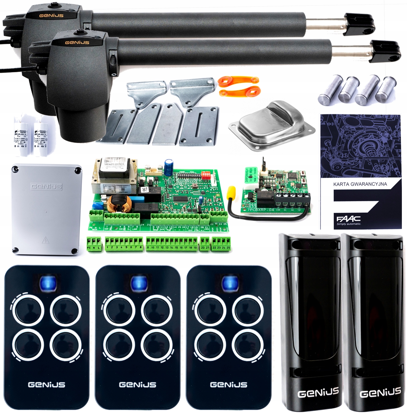 Dwa mocne siłowniki renomowanej marki FAAC GENIUS G-BAT 400 to idealne rozwiązanie dla bram dwuskrzydłowych do użytku przydomowego dla skrzydeł o długości 4m ( światło przejazdu 8m). Siłowniki posiadają wysuwane tłoki z stali nierdzewnej wykonane z wysokogatunkowego stopu. Siłowniki samoblokujące i dlatego nie wymaga stosowania dodatkowych zamków.