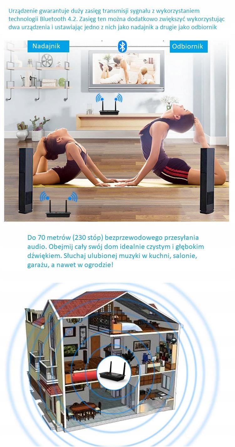 Zasięg teoretyczny może ulec zmianie ze względu na inne fale radiowe występujące w budynku, takie jak np. routery Wi-Fi, smartfony, inne urządzenia Bluetooth.