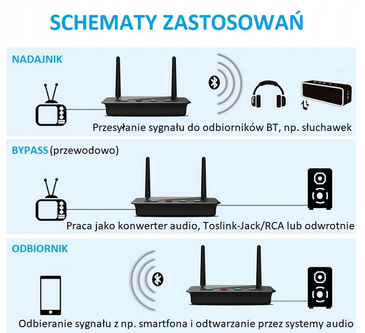 SP-B03 wspiera podłączenie analogowe (Jack 3,5mm; RCA) oraz cyfrowe (optyczne Toslink). W trybie pracy zwanym BYPASS, bez Bluetooth, może służyć jako konwerter audio i zmieniać sygnał z analogowego na optyczny lub z optycznego na analogowy.
