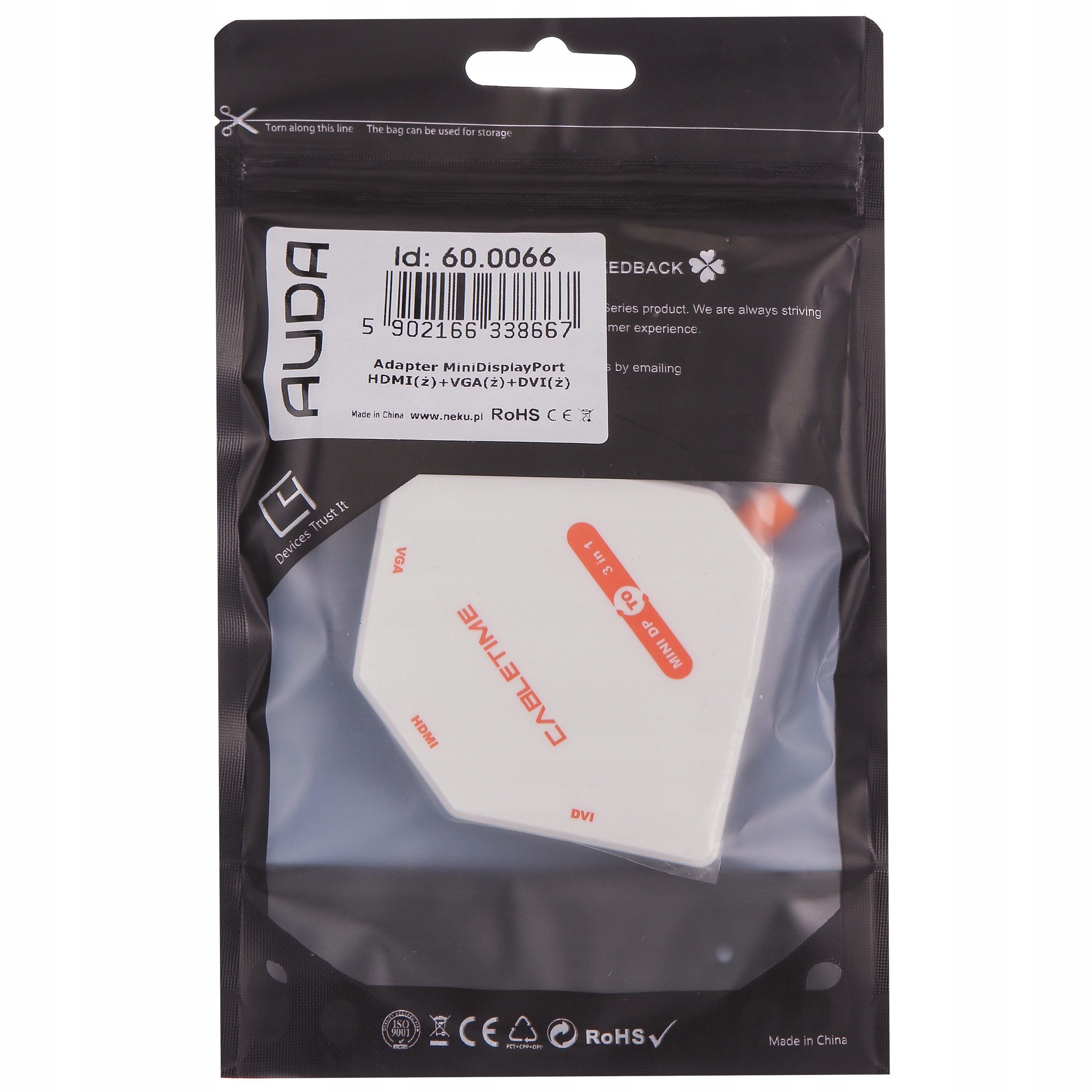 Wielofunkcyjny adapter marki AUDA, przeznaczony dla urządzeń z wyjściem typu mini DisplayPort. Pozwala na przesyłanie sygnału wideo w wysokiej rozdzielczości do Full HD 1080p.