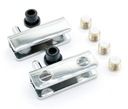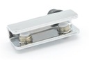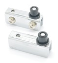 Opis: zestaw wykonany jest z metalu pokrytego warstwą chromu. Uchwyt wyposażony jest w wkładkę z materiału gumowego zapobiegającego przesuwaniu się założonego na szybie uchwytu. Montaż uchwytu polega na dogięciu jego ścianek do odpowiedniej grubości szklanych drzwi i wciśnięciu go. Zawiasy natomiast posiadają wkręty z nacięciem krzyżowym, dzięki którym można je prosto zamocować do szklanych drzwi. Wkręty zakończone są nakładkami z tworzywa zabezpieczającymi przed uszkodzeniem szyby.