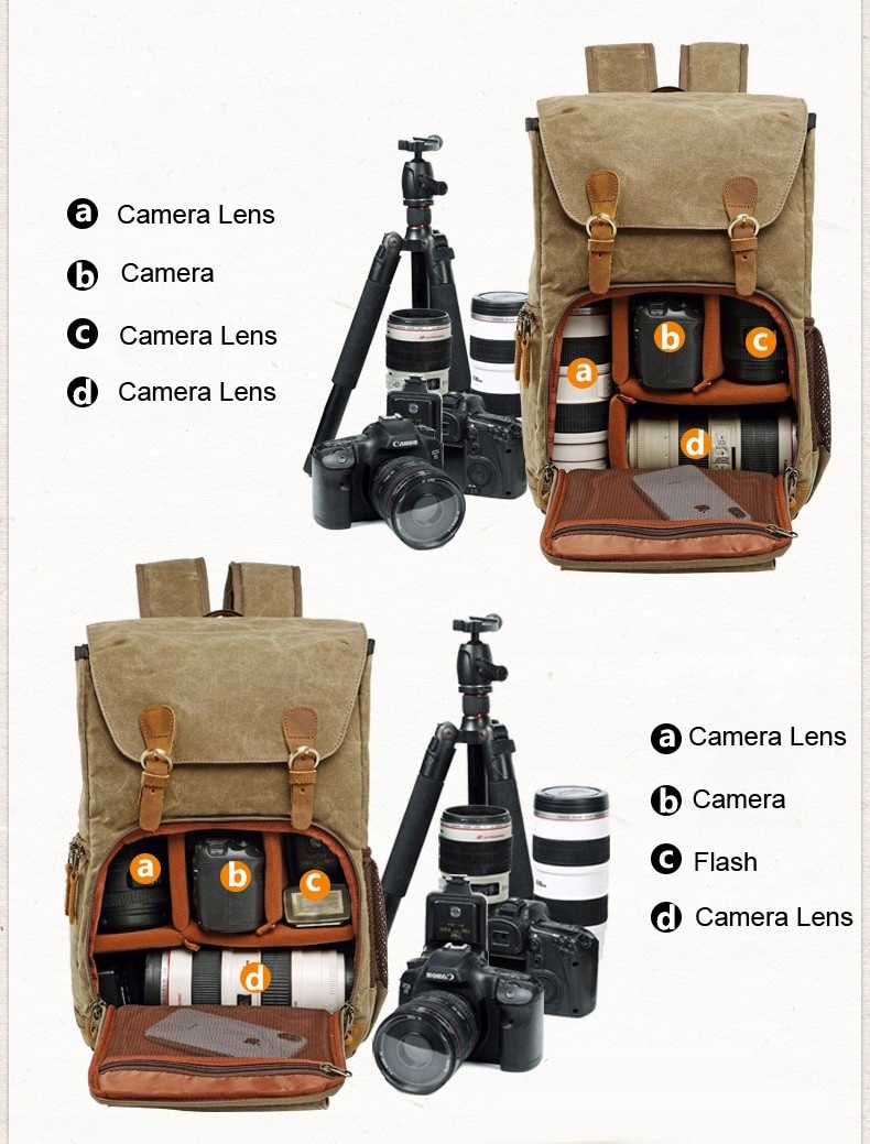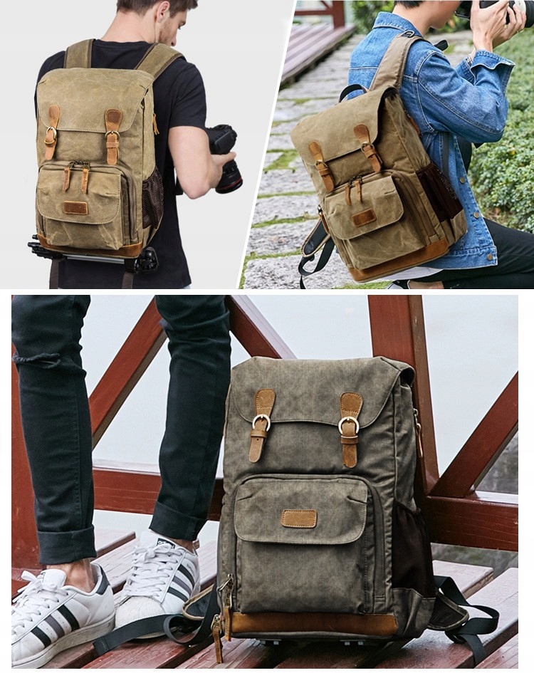 Plecak fotograficzny w stylistyce vintage przeznaczony na aparat, akcesoria fotograficzne i laptopa. Wykonany jest z wytrzymałego i wodoodpornego materiału Oxford. W głównej komorze plecaka, w jej dolnej części, znajduje się organizer na obiektywy i akcesoria fotograficzne. Posiada miękkie przegródki (przypinane na rzep), dzięki którym możesz oddzielić zapakowane akcesoria fotograficzne w dowolnej konfiguracji. Dostęp do niego jest z przodu plecaka oraz z boku przez tzw. kieszeń „szybkiego dostępu” (zawiera kieszonki na karty pamięci na klapie). W górnej części głównej komory znajduje się przestrzeń na rzeczy, siatkowa kieszeń zapinana na zamek i kieszeń na laptopa w rozmiarze do 14,1”. Główna komora jest zapinana na troczek i osłonięta klapą zapinaną na magnesy. Z boku plecaka znajduje się kieszeń na parasolkę lub napój. Z przodu jest kieszeń na podręczne rzeczy np. telefon. Statyw fotograficzny można przymocować specjalnymi troczkami pod spodem plecaka. Plecak posiada solidne, miękkie szelki z dodatkowym paskiem do spinania na wysokości klatki piersiowej, aby równomiernie rozłożyć ciężar podczas dłuższych wędrówek. Tył plecaka wyłożony są grubą, oddychającą gąbką o ergonomicznym kształcie, dzięki czemu plecak jest wygodny w noszeniu.