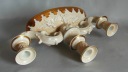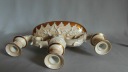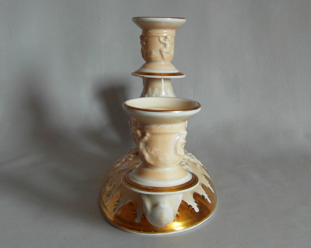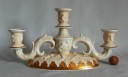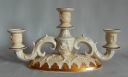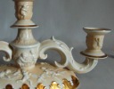 Świecznik trójramienny, efektowna forma całości. Beżowe tło dla wypukłych kupidynków, dodatkowo bogate złocenia.
