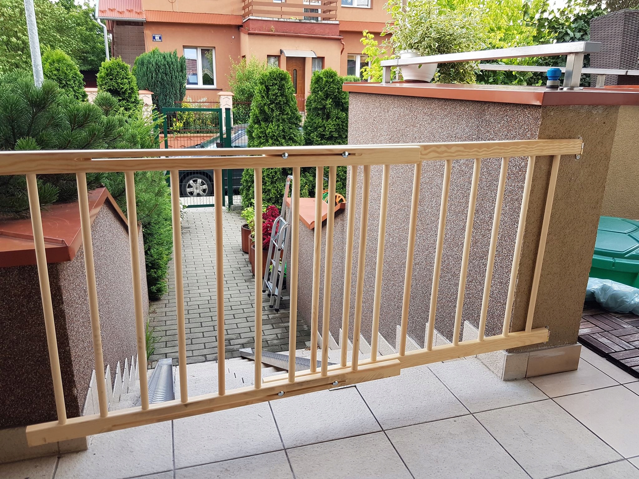 Bramka ochronna została wykonana z drewniana sosnowego najwyższej jakości, jest przykręcana, montowana na zawiasach czopowych (zasada działania identyczna jak przy drzwiach).