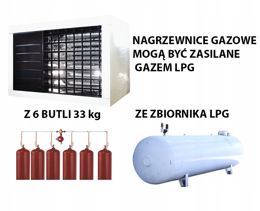 Poniżej prezentujemy przykład jak można zasilić nagrzewnicę gazową. Wystarczy reduktor automatyczny, węże i kilka butli 30 kg z propanem, lub propanem-butanem. Nagrzewnicę można również zasilić kilkoma butlami 11 kg. Nagrzewnica doskonale nadaje się do ogrzewania warsztatów samochodowych, hal produkcyjnych. Bardzo szybko można podnieść temperaturę w ogrzewanym pomieszczeniu. Można ustawić termostat na żądaną temperaturę i nagrzewnica utrzyma ją automatycznie.