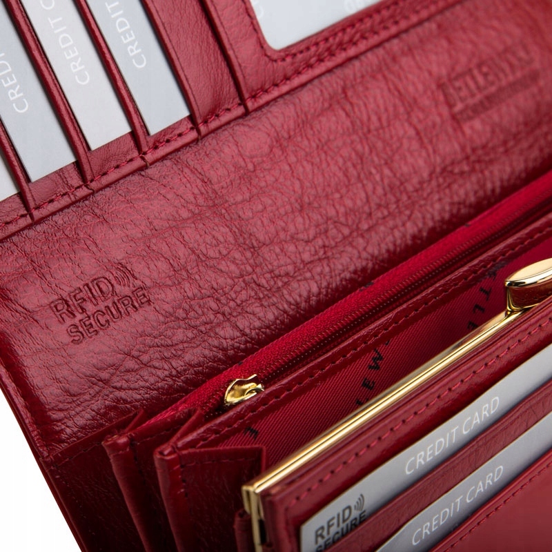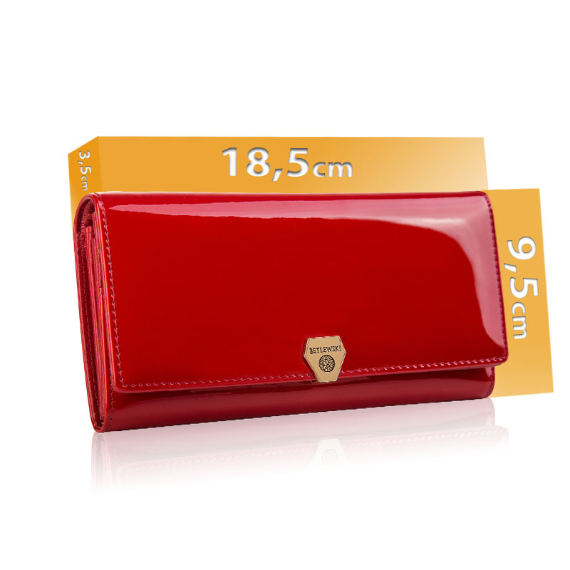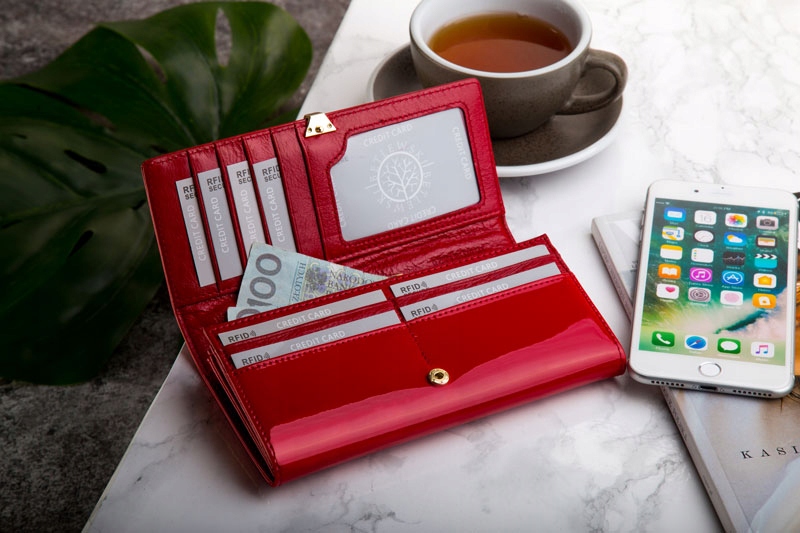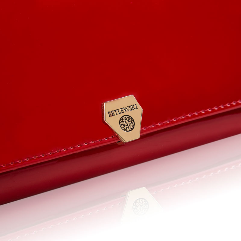 Portfel uszyty został ze skóry naturalnej w przepięknym czerwonym odcieniu - to wspaniały dodatek dla odważnej kobiety, kochającej modę i lubiącej stylowe dodatki. Skóra lakierowana jest w taki sposób, że portfel przepięknie błyszczy - jeśli lubisz wyraziste akcesoria, to będziesz nim zachwycona!
