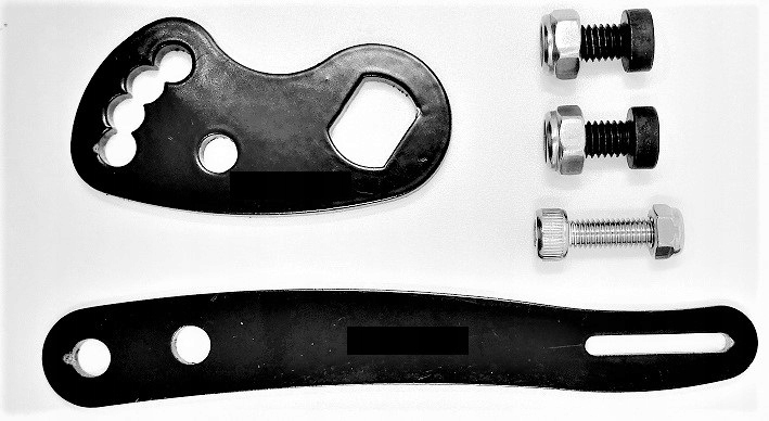 - Blokada obrotu - niezbędny element przy mocowaniu zestawu do konwersji. Zapobiegający obróceniu się osi silnika. Do blokady dodajemy także zestaw śrub.