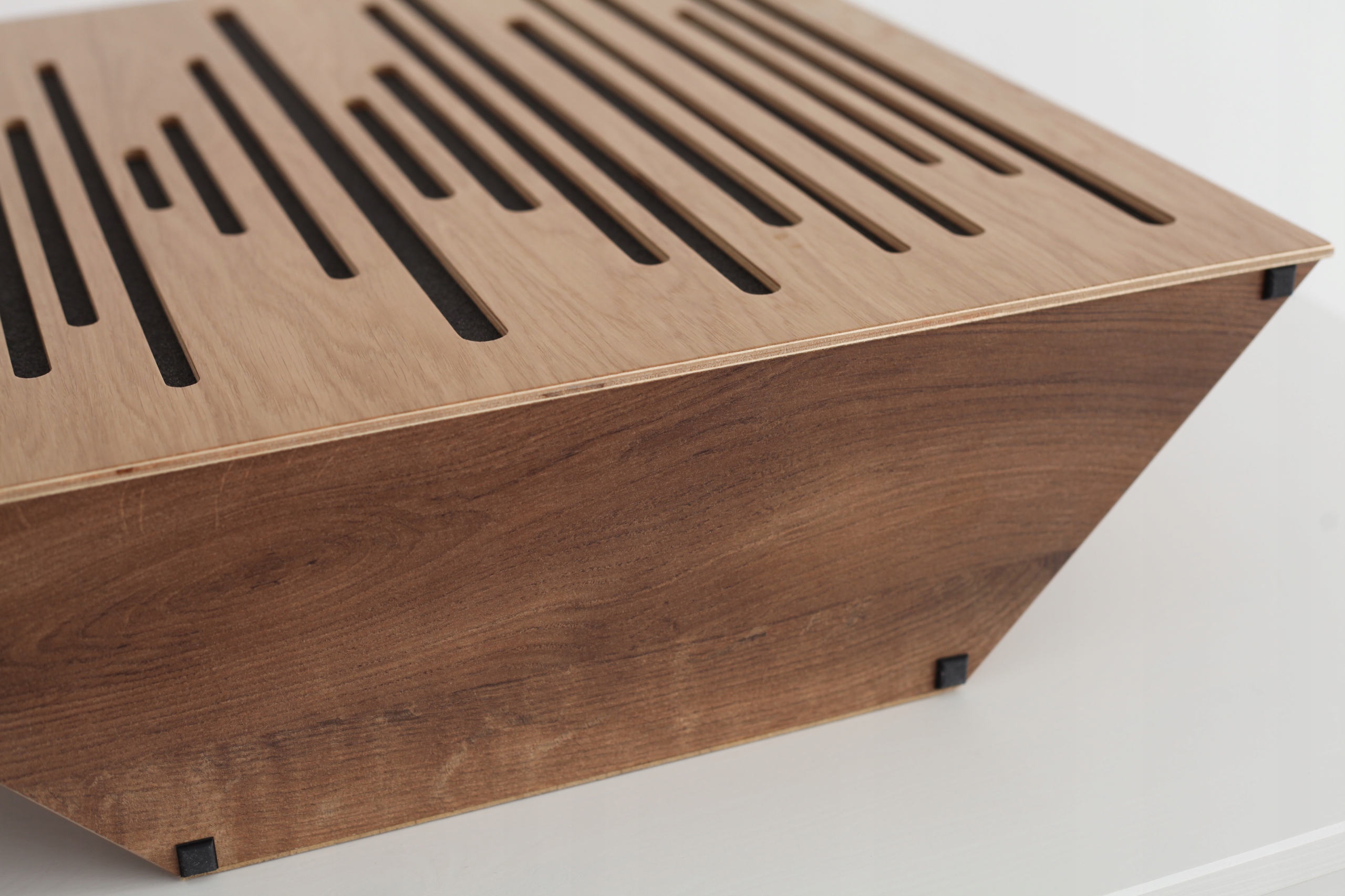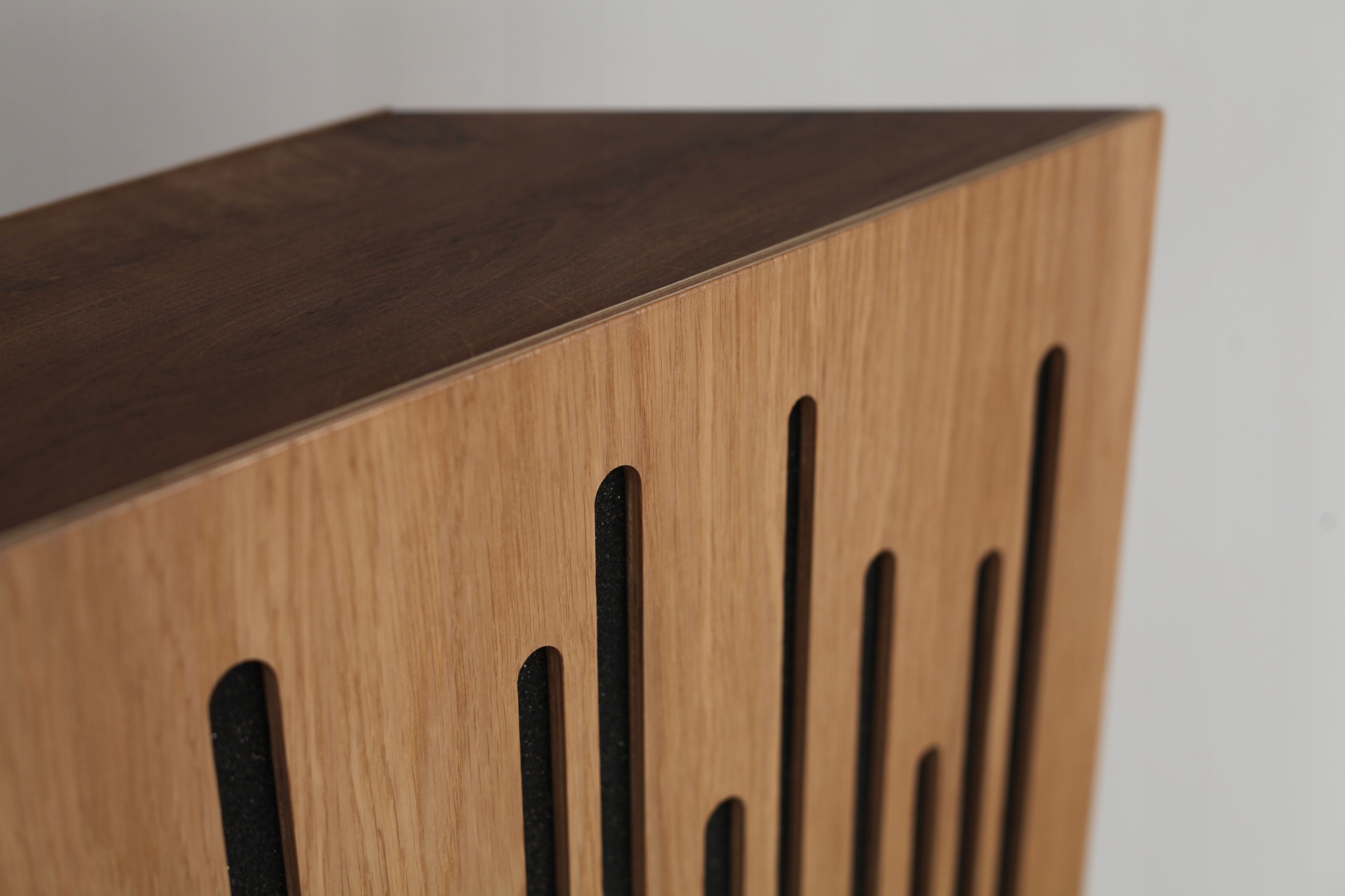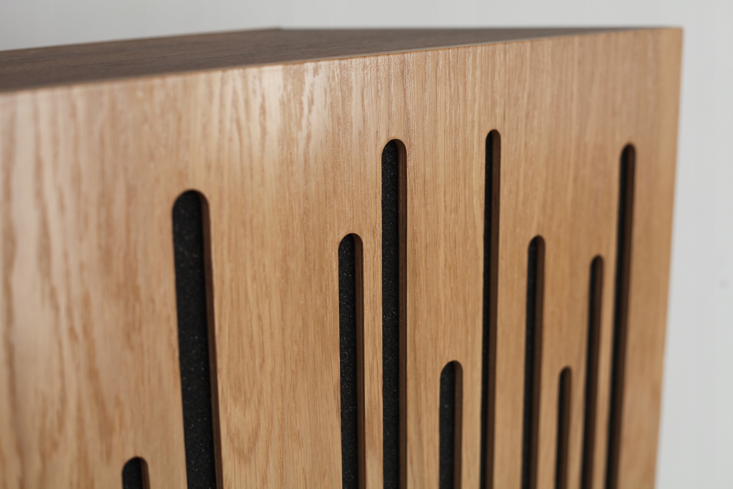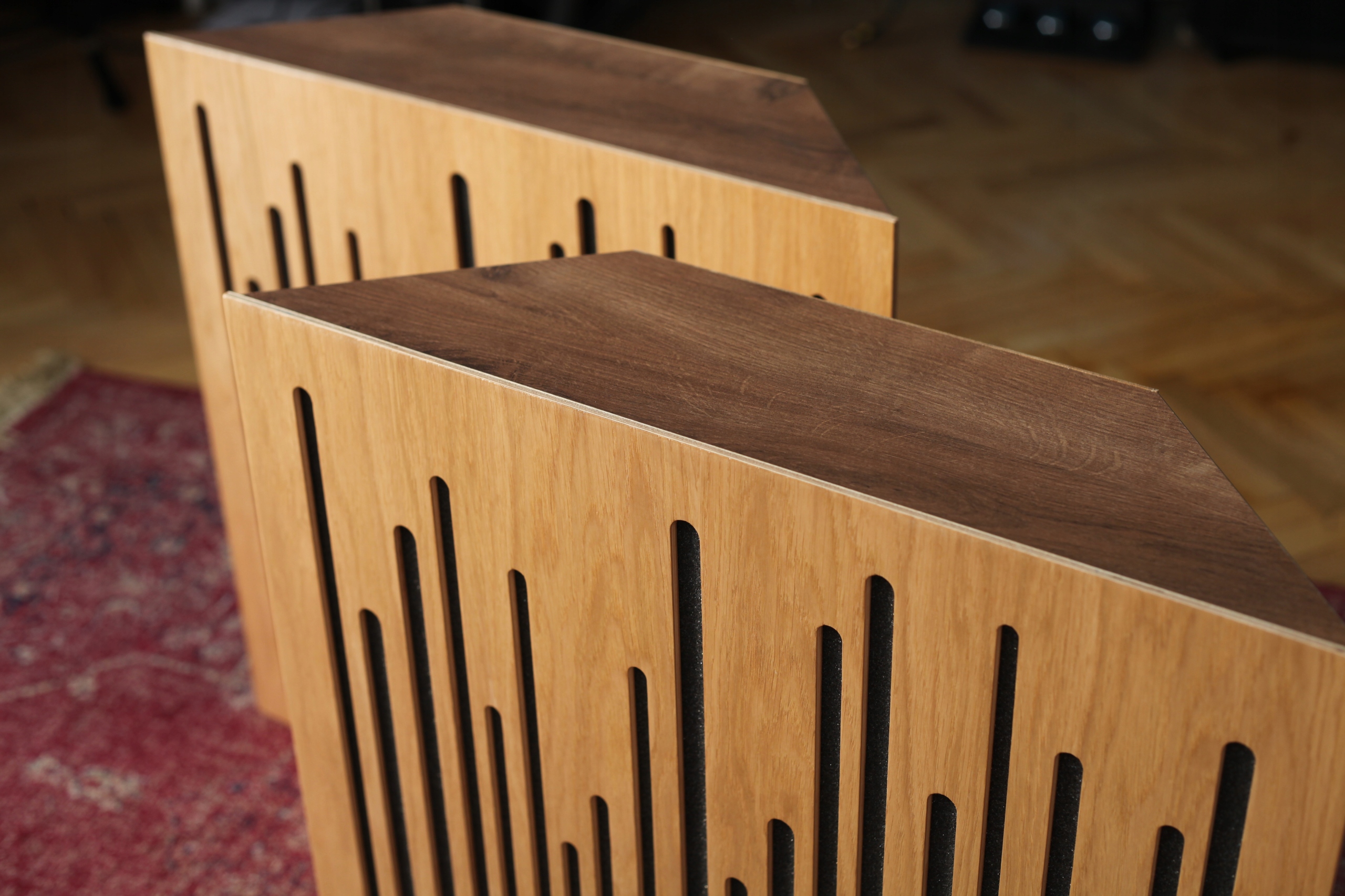 Фронты также играют роль рассеивателя средние и высокие частоты и отлично справляются с так называемым трепетающим эхом. Они сделаны издерева, окрашенные и дважды лакированные. Эстетика ловушек делает их оригинальным украшением каждый салон прослушивания.