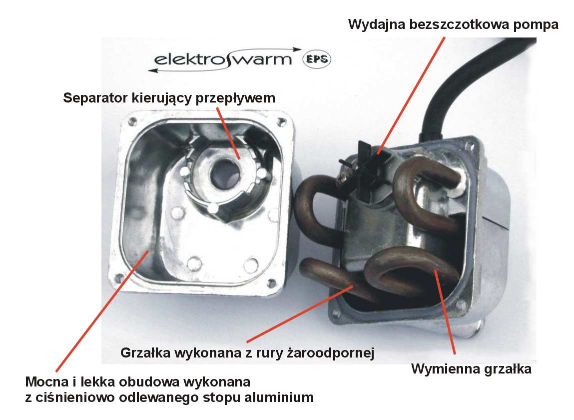Podgrzewacz służy do podgrzewania cieczy w układzie chłodzenia silnika w celu łatwego rozruchu w okresie zimowym. Można go także zastosować do podgrzewania cieczy chłodzącej przepływającej przez parownik/reduktor w wózkach widłowych zasilanych gazem co umożliwia łatwe uruchomienie silnika. Podgrzewacz nie nadaje się do podgrzewania agregatów prądotwórczych awaryjnego zasilania. Podgrzewacz pompowy EPS Elektrowarm, to nowoczesne, szybkie w działaniu urządzenie grzejne. Podgrzewacz wyposażony jest w grzejnik elektryczny o mocy 1850W, zasilany prądem o napięciu 230V oraz nowoczesną bez szczotkową pompę tłoczącą. Grzałka wykonana jest z rury żaroodpornej, dzięki czemu ryzyko jej przepalenia jest niewielkie. Pompa podgrzewacza smarowana jest czynnikiem chłodzącym znajdującym się w układzie chłodzenia, co eliminuje ryzyko jej rozszczelnienia i zatarcia (jak ma to miejsce w pompach smarowanych olejem). Podgrzewacze posiadają separator uniemożliwiający przedostawanie się zabrudzeń na oś pompy (zabrudzenia mogły by powodować zablokowanie pompy). Posiadamy wszystkie części serwisowe do oferowanych podgrzewaczy. Produkt nowy z gwarancją.