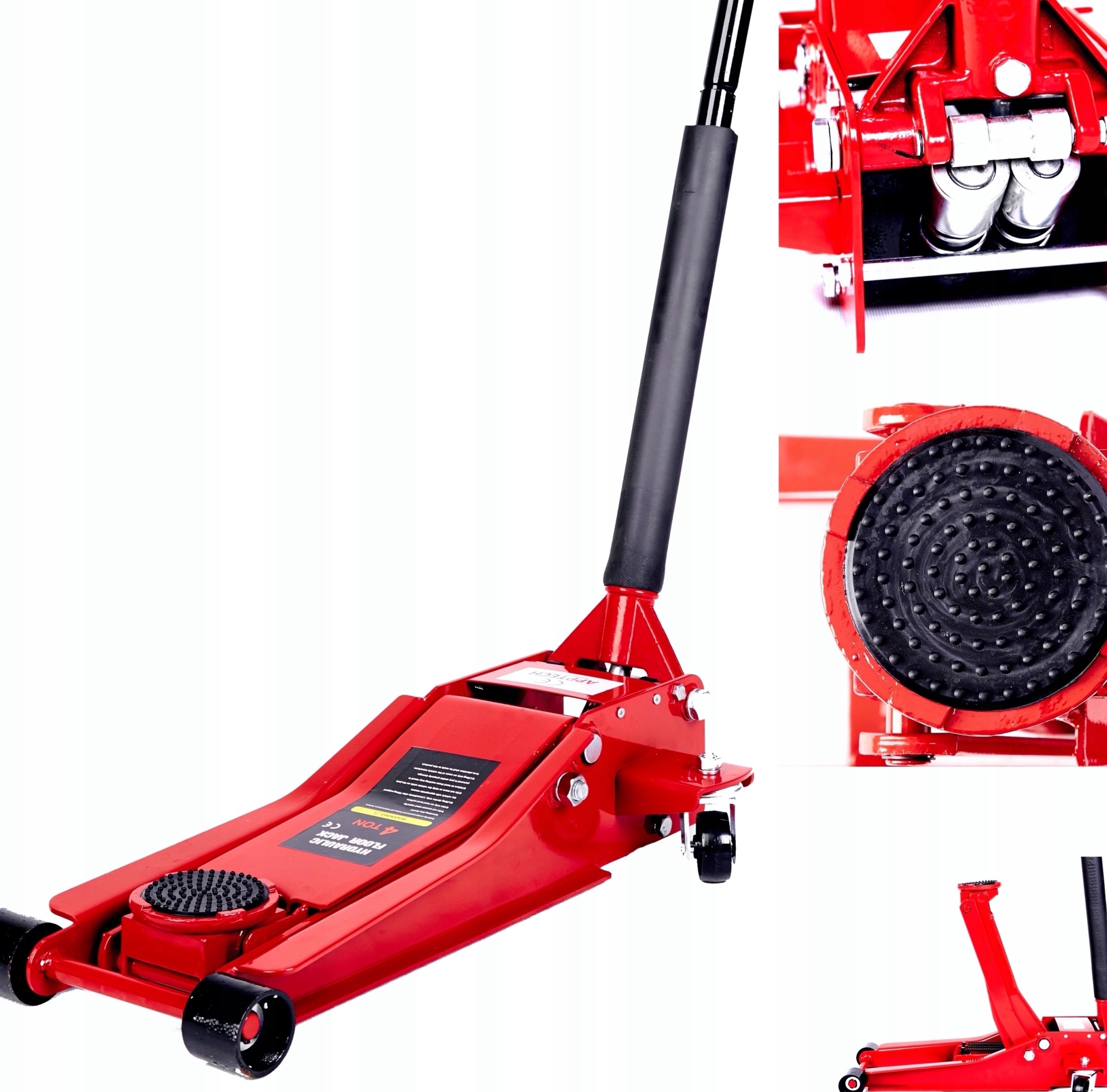Podnośnik niskoproofilowy typu żaba 4T. Podnośniki zostały wyposażone w mocny 2 stopniowy siłownik ( 2 tłoki), oraz 4 mocne , szerokie koła - tylne koła skrętne