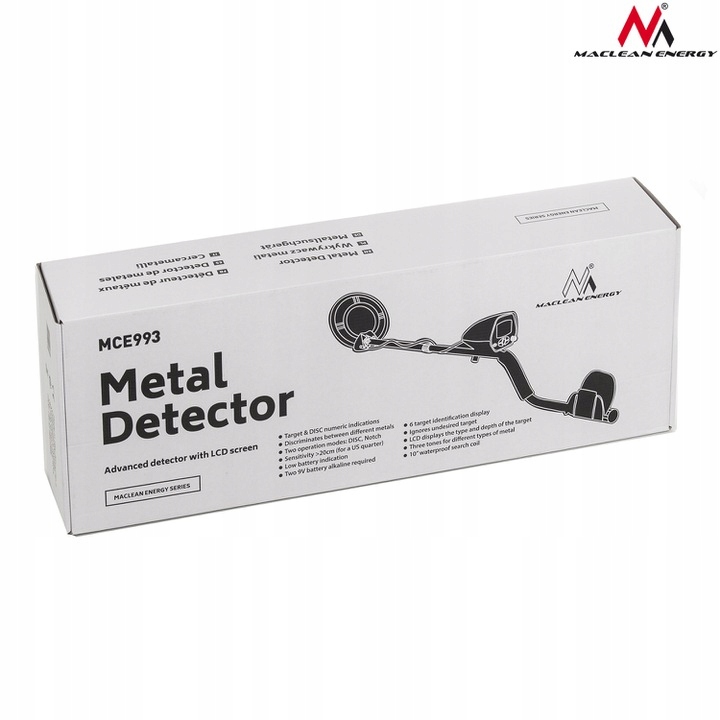 Maclean Energy MCE993 posiada podramienny uchwyt oraz regulowaną długość ramienia sondy. Wyniki pomiarów odczytuje się na czytelnym wskaźniku LCD oraz słyszy się sygnał akustyczny. Aby nie zwracać na siebie uwagi wystarczy podpiąć słuchawki do gniazda Jack 3.5mm. Co odróżnia nasz wykrywacz od podobnych konstrukcji na allegro? Nasz wykrywacz jako jedyny posiada dużą nowoczesną cewkę 25cm (10”), regulowany mankiet przedramienia, nowoczesny moduł elektroniki zabudowany w bezpieczną konsolę wykonaną z wysokiej jakości tworzywa. Dodatkowo nasz wykrywacz jest barwiony na kolor kanarkowy podobnie jak produkty firmy Garrett. Wykrywacz posiada regulację dyskryminacji oraz dodatkowo gniazdo słuchawkowe. Dzięki dobremu wyważeniu urządzenia i wygodnemu uchwytowi pod ramię, praca poszukiwacza stanie się jeszcze większą przyjemnością. Głębokości przeszukiwania (orientacyjnie): - Małe przedmioty np. monety: do 22cm - Średnie przedmioty np. pistolet: do 40cm - Duże przedmioty np. zbroja rycerska: do 80cm - Bardzo duże przedmioty np. czołg: do 160cm