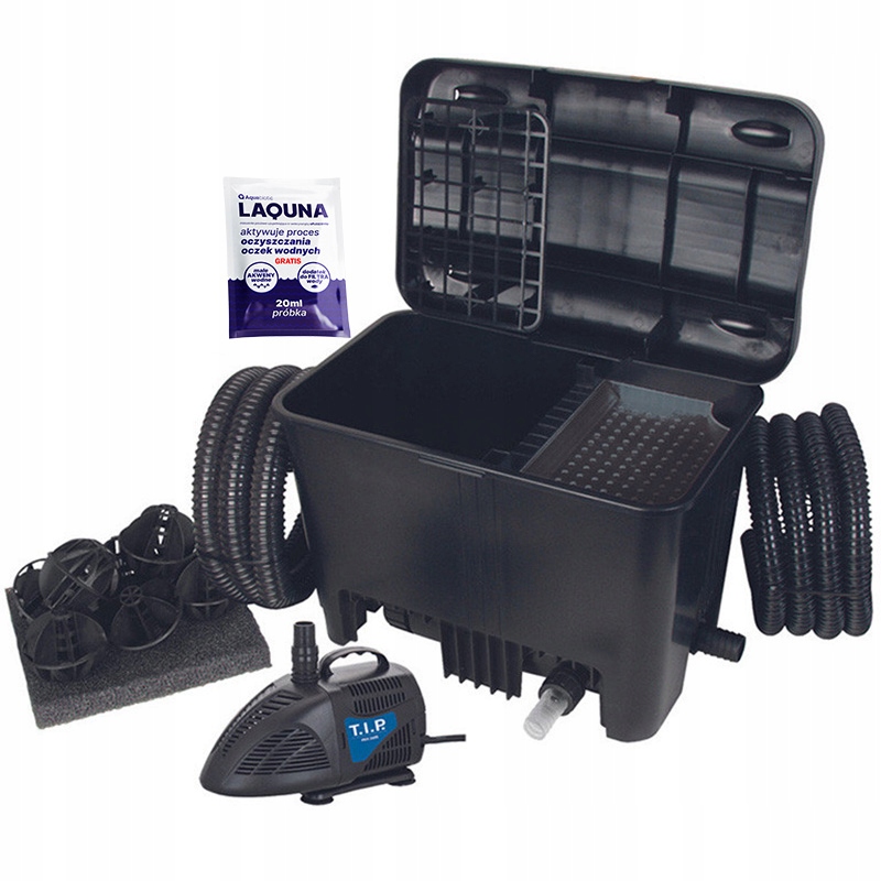 Kompletny system składa się z lampy UV-C, materiału filtrującego, pompy, węża wlotowego i wylotowego oraz różnych przyłączy.