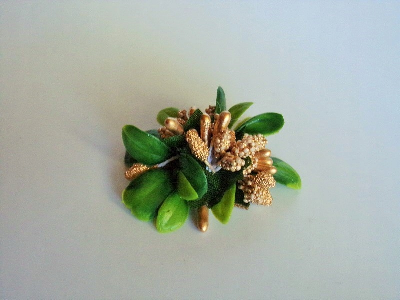 Bukiecik wykonany jest z kolorowych dodatków florystycznych i zielonych listków.