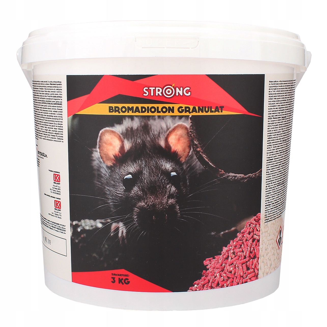 STRONG BROMADIOLON GRANULAT to bardzo skuteczny środek gryzoniobójczy w formie granulatu do zwalczania myszy i szczurów. Gryzonie po przyjęciu dawki preparatu giną bezstresowo z powodu wewnętrznego krwotoku długo po spożyciu (produkt nie prowadzi do zgonu przed upływem 48 godzin, nawet po spożyciu dużej dawki) i daleko od miejsca wyłożenia.