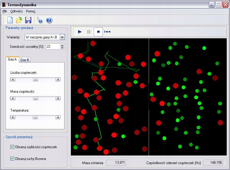 В термодинамике мы можем наблюдать движениемолекулы газа и его зависимость от количества и массы молекул и температуры. Мы также можем отслеживать смешивание молекул газа между двумя помещениями и наблюдать броуновское движение выбранной молекулы.