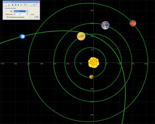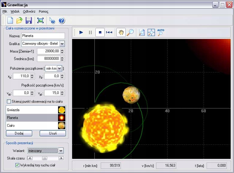 И так, например. в гравитации можно экспериментировать с любыми системами небесных тел: звезд, планет, кометы, космические корабли или черные дыры в моделируемом гравитационном поле. Вы также можете загрузить с в настройка всей Солнечной системы от 1 января 2000 г. Другой пример-тесный система звезды и массивной планеты, вызывающая характерное колебание звезды, благодаря которому сегодня обнаруживаются экзопланеты.