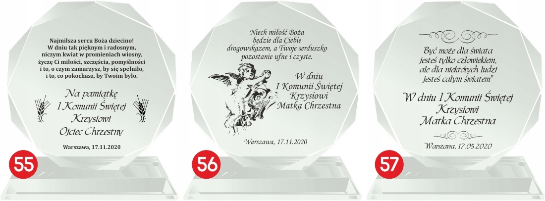 W przypadku większej ilości zmian prosimy o dokładne ich sprecyzowanie - dokładnie nam to opisz. Jeżeli wybrany numer graweru wymaga dodatkowych zmian lub innych danych, również je załącz w notatce dla sprzedającego lub wyślij osobnym mailem. W przypadku niekompletnych danych, nie będziemy w stanie wykonać i wysłać Twojego zamówienia. Za ewentualne opóźnienia związane z niekompletnie przesłanym zamówieniem - nie odpowiadamy. Jeżeli podziękowanie ma być wręczone: mamie, tacie lub innej osobie prosimy to dokładnie opisać. Sprzedający informuje, iż produkty wykonane z kryształu mogą zawierać niewielkie zarysowania ich powierzchni oraz pęcherzyki powietrza wynikające z procesu ich produkcji.