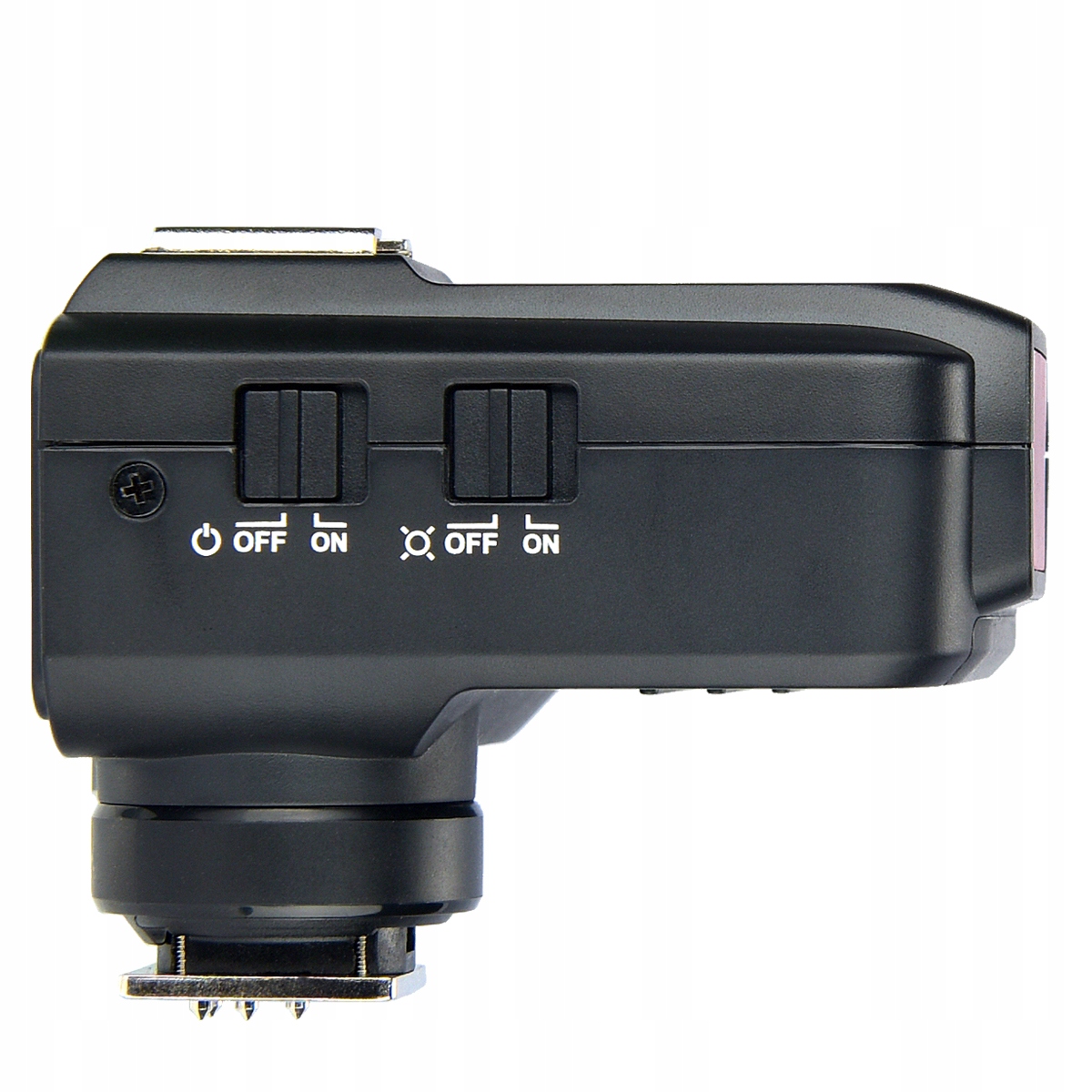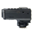 Pokrętło sterujące i niemal wszystkie klawisze zostały ulokowane po lewej stronie obudowy co powoduje, że nie trzeba odrywać prawej ręki trzymającej aparat, aby dokonać zmian w mocy oświetlenia. Na górnym panelu obudowy umieszczona jest stopka służąca do podłączenia nadajnika innego systemu radiowego np. Quadralite Navigator Kit, i używania go jednocześnie z Navigatorem X Plus (górna stopka połączeniowa nie jest przewidziana do tego, aby podpinać do niej lampy błyskowe). Z przodu obudowy umieszczona jest dioda, której podstawowym zadaniem jest wspomaganie automatycznych systemów ustawiania ostrości, w których wyposażone są aparaty (wspomaganie autofokusa nie działa z wszystkimi aparatami. Więcej szczegółów znajduje się w instrukcji obsługi nadajnika). Przyda się to szczególnie w sytuacjach, gdy sesja odbywa się w warunkach słabego oświetlenia zarówno w studiu jak i poza nim. Podłączenie nadajnika do aparatu zostało udoskonalone i opiera się na stopce wyposażonej w mechanizm blokady, który pozwala na szybkie podpięcie i odpięcie urządzenia. Na bocznym panelu obudowy znajduje się złącze USB typu C, które służy do aktualizacji oprogramowania wewnętrznego oraz port synchronizacji przewodowej, który może zarówno przyjmować jaki wyprowadzać sygnał na zewnątrz. Nadajnik zasilany jest za pomocą dwóch baterii typu AA.