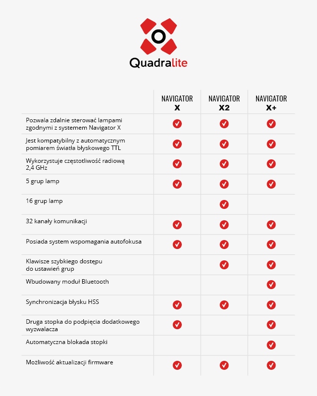 Navigator X Plus łączy w sobie zalety obu wcześniej zaprezentowanych generacji Navigatorów X. Zachowując niewielką obudowę udało się zmieścić niemal wszystkie funkcje znane z modelu X2 jednocześnie dodając nowe. Największą nowością w modelu X Plus jest wbudowany system Bluetooth, który pozwala połączyć go z aplikacją Quadralite Photo App służącą do sterowania lampami błyskowymi z poziomu telefonu czy tabletu (Android i iOS).