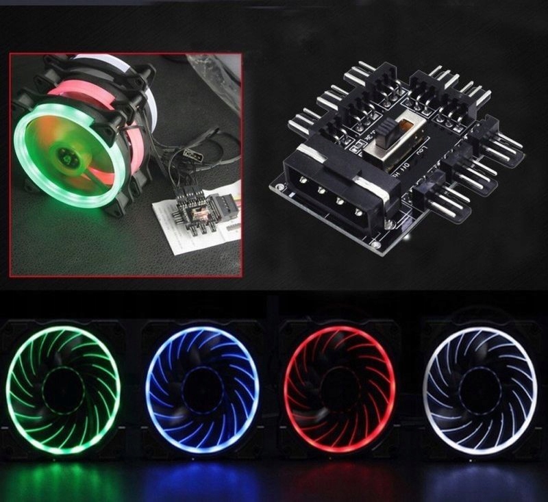 Распределитель, позволяющий пониженное до 8 вентиляторов. Имеет 8 разъемов 3 контактный разъем и питание снята с порта MOLEX. Кнопка Off/low/high, для ручного управления работой вентиляторов. Светодиод индицирующий работу адаптера. С задней части адаптера расположен клейкой ленты 3М, которая легко и надежно приклеивается пластина для корпуса компьютера.