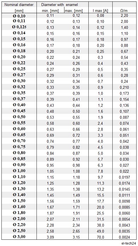 Jest to średnica żyły miedzianej. Średnica wraz z warstwą emalii podana w tabeli.